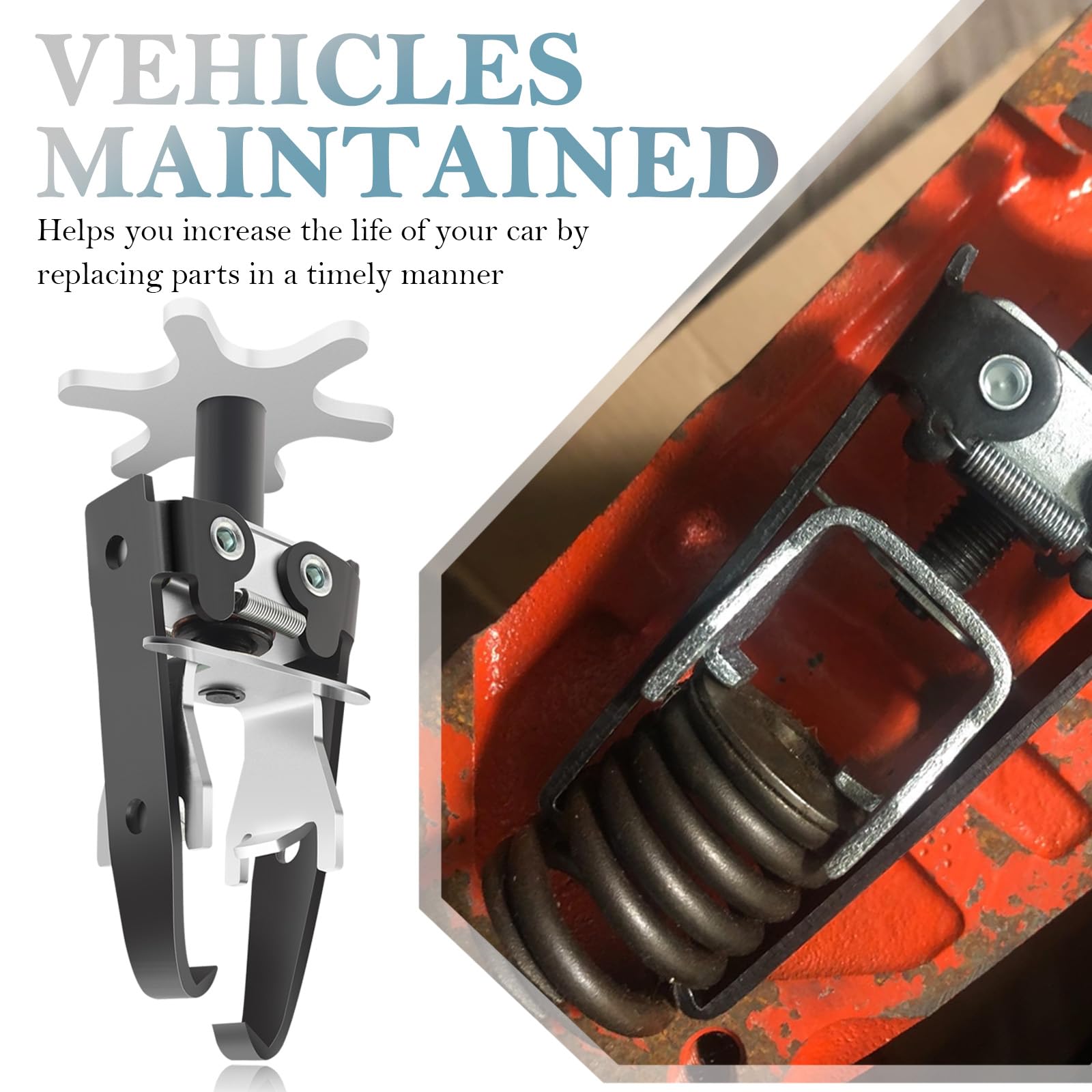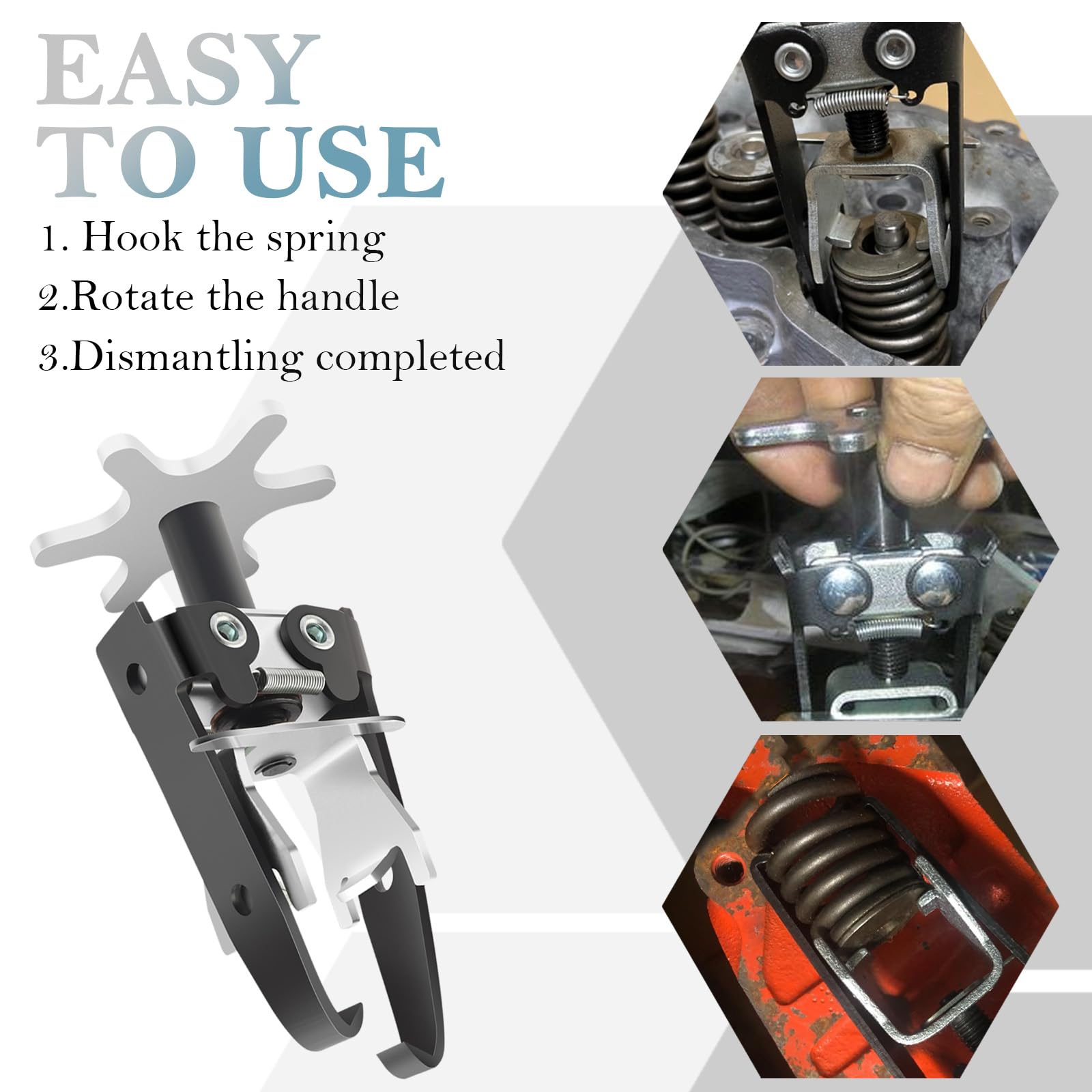 - Easy Disassembly: Our valve spring compressor simplifies the cumbersome removal of cylinder heads and camshafts with older disassembly tools. A simple turn of the handle compresses the valve spring seat and exposes the valve retainer for spring repair