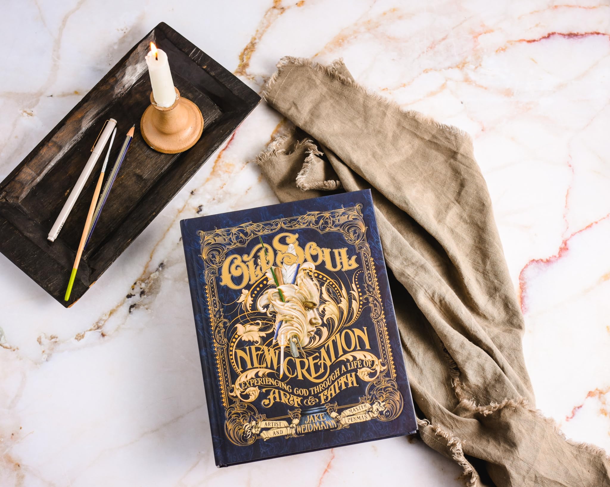 Renew your soul through the beauty of art and creativity. Certified as one of nine Master Penmen in the world, fine artist Jake Weidmann invites you to immerse yourself in the centuries-old tradition of communing with God through creative work in this incredible art-driven coffee table book highlighting ten of Jake’s most renowned works. Whether you prefer a pen, a paintbrush, or an iPad, every creative endeavor you undertake is a testimony to how God made you in His image. As the youngest certified Master Penman in the world, Jake knows the dedication it takes to hone skill and refine talent to be a successful creator. But as an acclaimed painter and woodworker, Jake Weidmann also has firsthand experience of drawing near and relying on his Creator to guide his work. For the first time, Jake invites you into his artist’s studio to see the Maker’s steady hand at work in his life and art, and ultimately to inspire you to embrace God’s calling over you, whatever it may be. Old Soul, New Creation features ten of Jake’s creations, along with in-progress photographs and stories of the artistic and spiritual struggle behind each. This stunning book is ultimately a story of God’s goodness, His faithfulness, and His loving calling–all of which you can experience when you embrace the talents God gives you. As you sink into the words and images of Old Soul, New Creation, you’ll discover: Full-color photography of Jake’s artwork–available in book form for the first time–along with original calligraphy and illustrations from the author Personal stories and biblical insights about experiencing transformation through your work and talent Prayers to encourage you to lean on God as you pursue your passions Old Soul, New Creation is for anyone who: Delights in fine art and beautiful craftsmanship Seeks inspiration to forge ahead through artistic struggles Wants a deeper understanding of a theology of work Longs for creative Christian community Desires richer purpose and spiritual depth in their creative pursuits Slow down, breathe, and let your spirit be renewed through the beauty of art and craftsmanship in Old Soul, New Creation. As Jake writes, “God is creating in you. How will you join Him?”