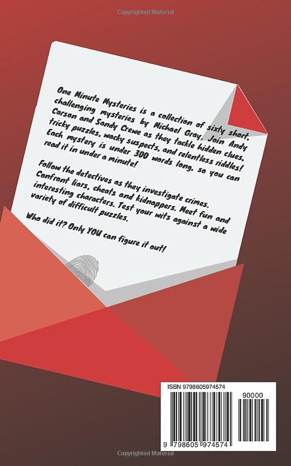 “One Minute Mysteries” is a collection of sixty short, challenging mysteries by Michael Gray. Join Andy Carson and Sandy Crewe as they tackle hidden clues, tricky puzzles, wacky suspects, and relentless riddles! Each mystery is under 300 words long, so you can read it in under a minute! Follow the detectives as they investigate crimes Confront liars, cheats and kidnappers Meet fun and interesting characters Test your wits against a wide variety of difficult puzzles Who did it? Only YOU can figure it out!