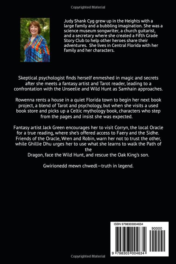 Rowenna rents a house in a quiet Florida town to begin her next book project, a blend of Tarot and psychology. When she visits a used book store, she picks up a Celtic mythology book containing characters who step from the pages and insist she was expected. Fantasy artist Jack Green encourages her to visit Corryn, the local Oracle for a true reading, where she’s offered access to Faery and the Sidhe. Friends of the Oracle, Wren and Robin, warn her not to trust the other, while Ghillie Dhu urges her to use what she learns to walk the Path of the Dragon, face the Wild Hunt, and rescue the Oak King’s son. Gwirionedd mewn chwedl–truth in legend.