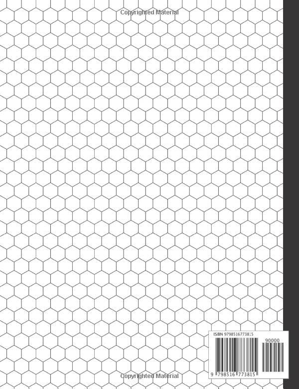 Perfect hexagonal graph paper notebook for everyone: Ideal size (7.44″ x 9.69″) for convenient use and portability 100 pages of hexagonal grid paper with hexagon diameter of about 1/4 inch (each hexagon side measuring 0.2 inch or 0.5 cm) Hexagons aligned in the correct direction for drawing carbon chains & organic chemistry structures Expertly calibrated light grey hexagonal grid – with the right level of darkness that still allows you to see what you draw clearly High-quality durable white paper pages Professionally designed, stylish soft matte cover Perfect for college organic chemistry & biochemistry classes, chemistry lab notebook, science & math graphing, fantasy role-playing game (RPG) map drawing, quilting design, artistic sketches, and more! Published by Hexagonal Lab Studio and shipped fast by Amazon. Click “add to cart” to grab your copy today!
