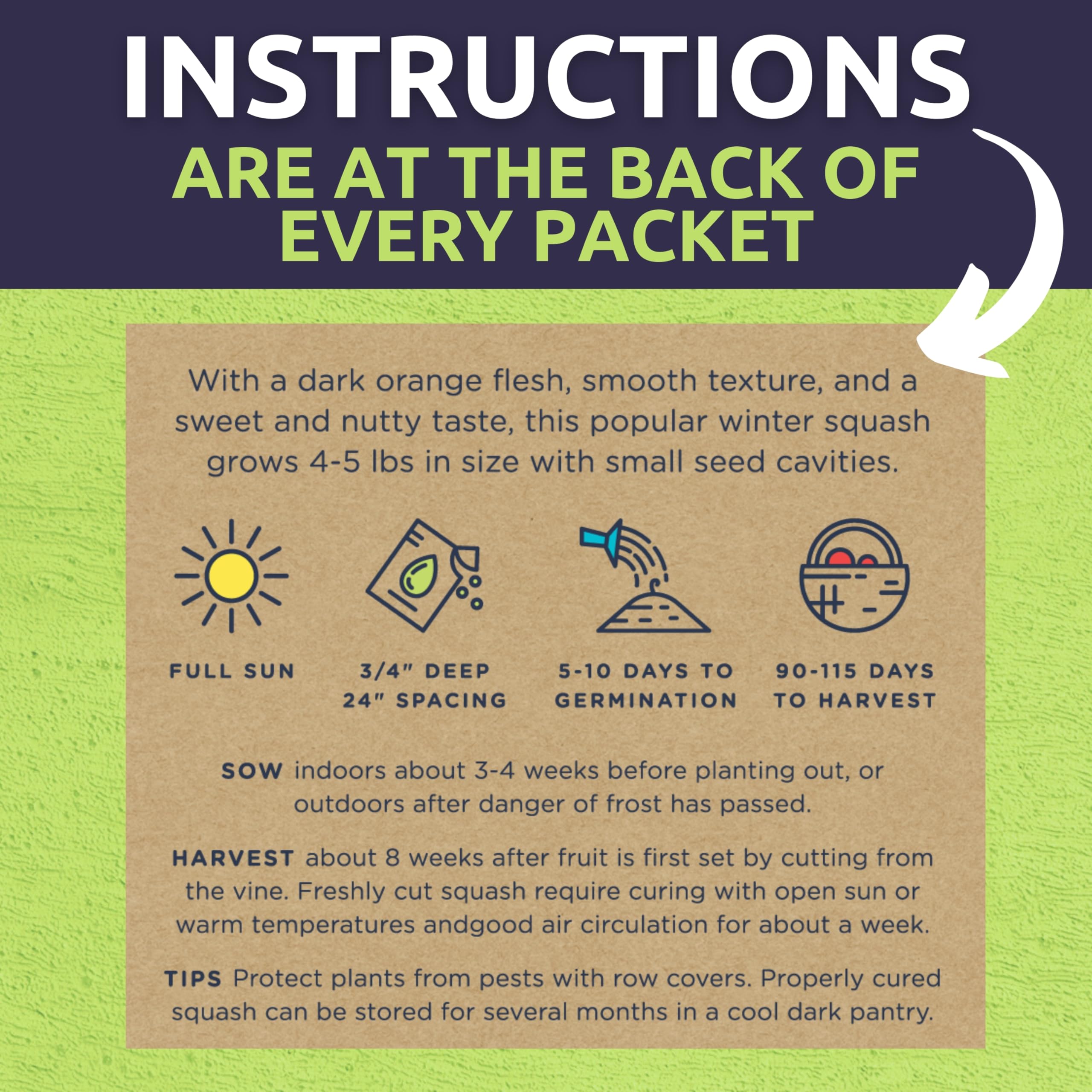 - 10 INDIVIDUAL SEED PACKETS: Detroit Dark Red Beet, Waltham 29 Broccoli, Waltham Butternut Winter Squash, Charentais Melon, Parris Island Romaine Lettuce, Tom Thumb Lettuce, Little Finger Carrot, Bloomsdale Longstanding Spinach, Matt’s Wild Cherry Tomato, Sugar Baby Watermelon.
