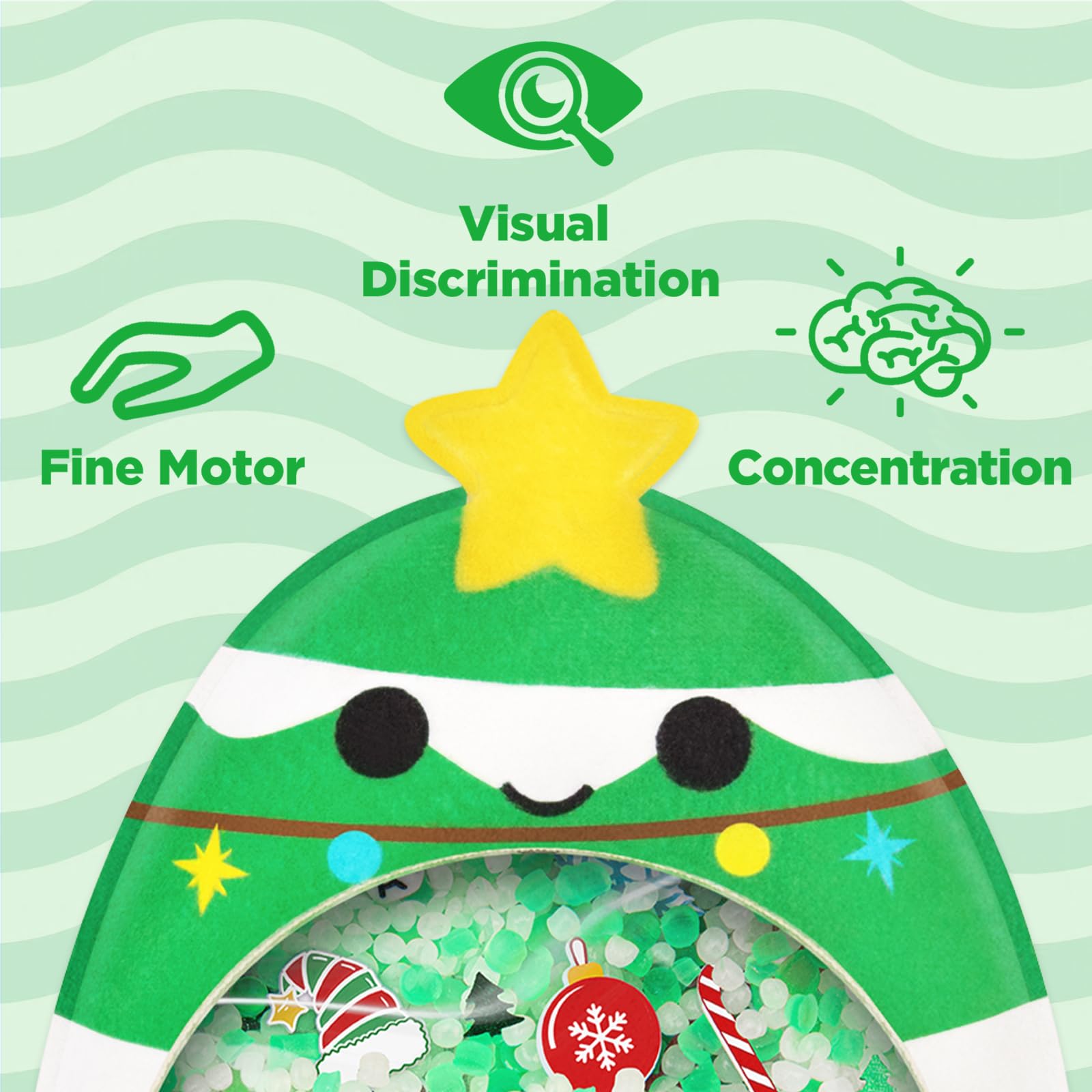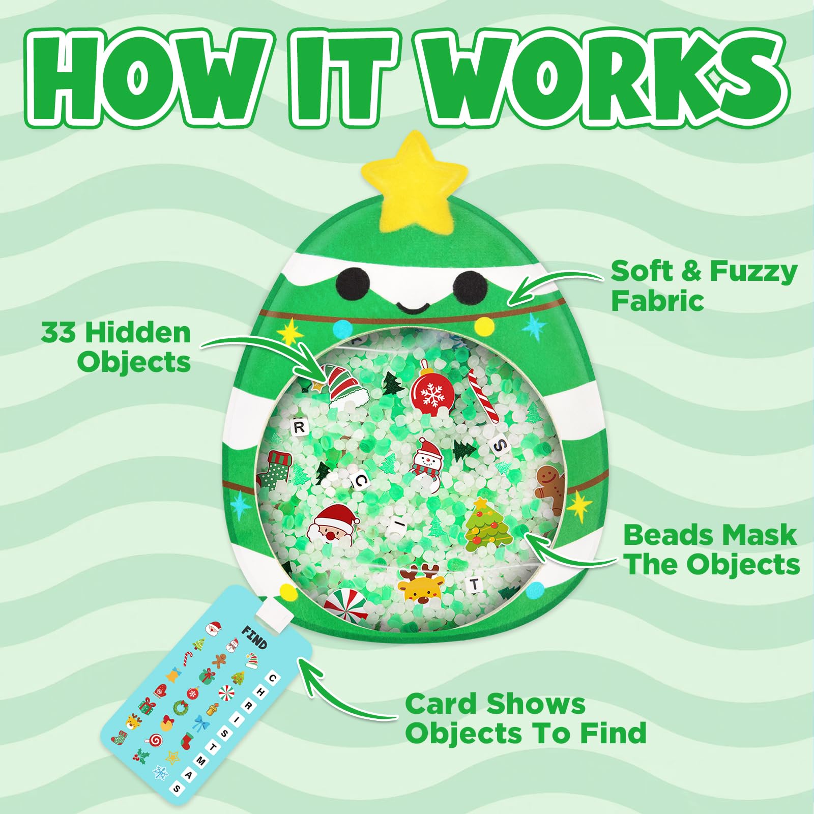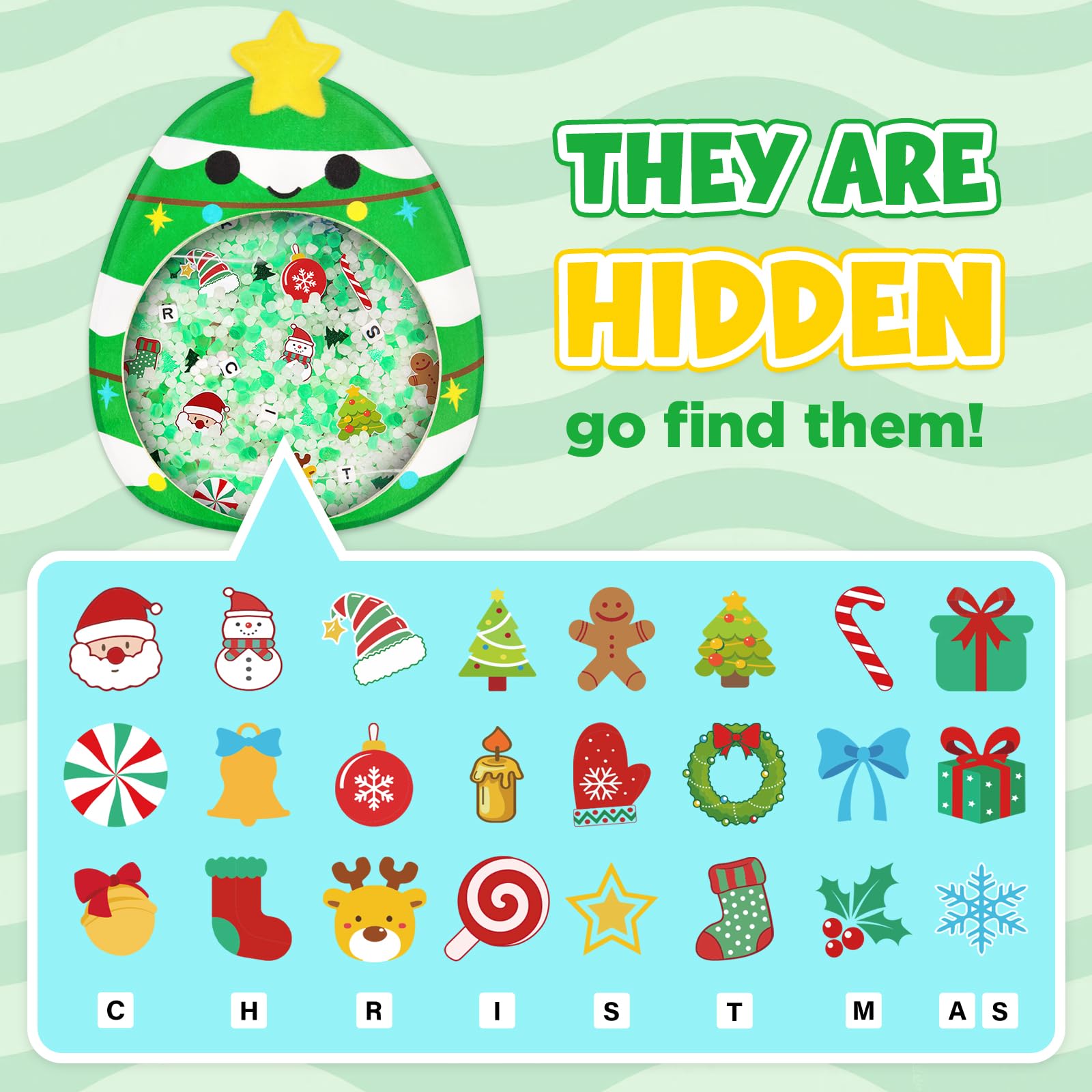 Filled with colorful beads, Christmas tree glitter, and 33 hidden Christmas-themed objects–24 festive toys and 9 letter beads.
