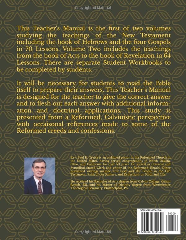 This is the first of two manuals for pastors, teachers or Bible study leaders which correspond to separate Student Workbooks. Volume One begins with the book of Hebrews as a bridge between the Old and New Testaments. The remaining Lessons study all the Gospels up to the book of Acts. This Volume contains 70 lessons with both the questions and answers written out. Volume Two continues with 64 lessons covering Acts of the Apostles to the book of Revelation. The purpose of the Manual is to give the answers and to expand on them for the sake of additional information. This study is presented from a conservative. Reformed, Calvinistic perspective.