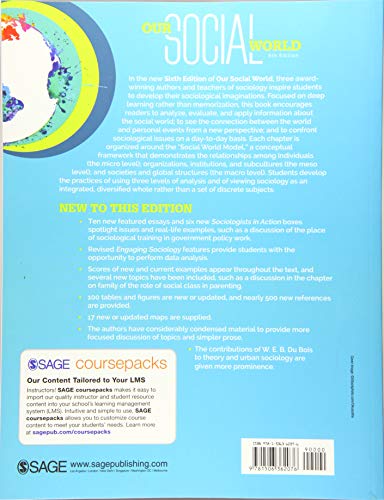The Eighth Edition of Our Social World: Introduction to Sociology inspires students to develop their sociological imaginations, to see the world and personal events from a new perspective, and to confront sociological issues on a day-to-day basis. The text is organized around the “Social World” model, a conceptual framework that demonstrates the relationships among individuals (the micro level); organizations, institutions, and subcultures (the meso level); and societies and global structures (the macro level). The consistent application of the Social World Model across chapters (represented in a visual diagram in the chapter openers) helps students develop the practice of using three levels of analysis, and to view sociology as an integrated whole, rather than a set of disparate subjects. This title is accompanied by a complete teaching and learning package in SAGE Vantage, an intuitive learning platform that integrates quality SAGE textbook content with assignable multimedia activities and auto-graded assessments to drive student engagement and ensure accountability. Unparalleled in its ease of use and built for dynamic teaching and learning, Vantage offers customizable LMS integration and best-in-class support.