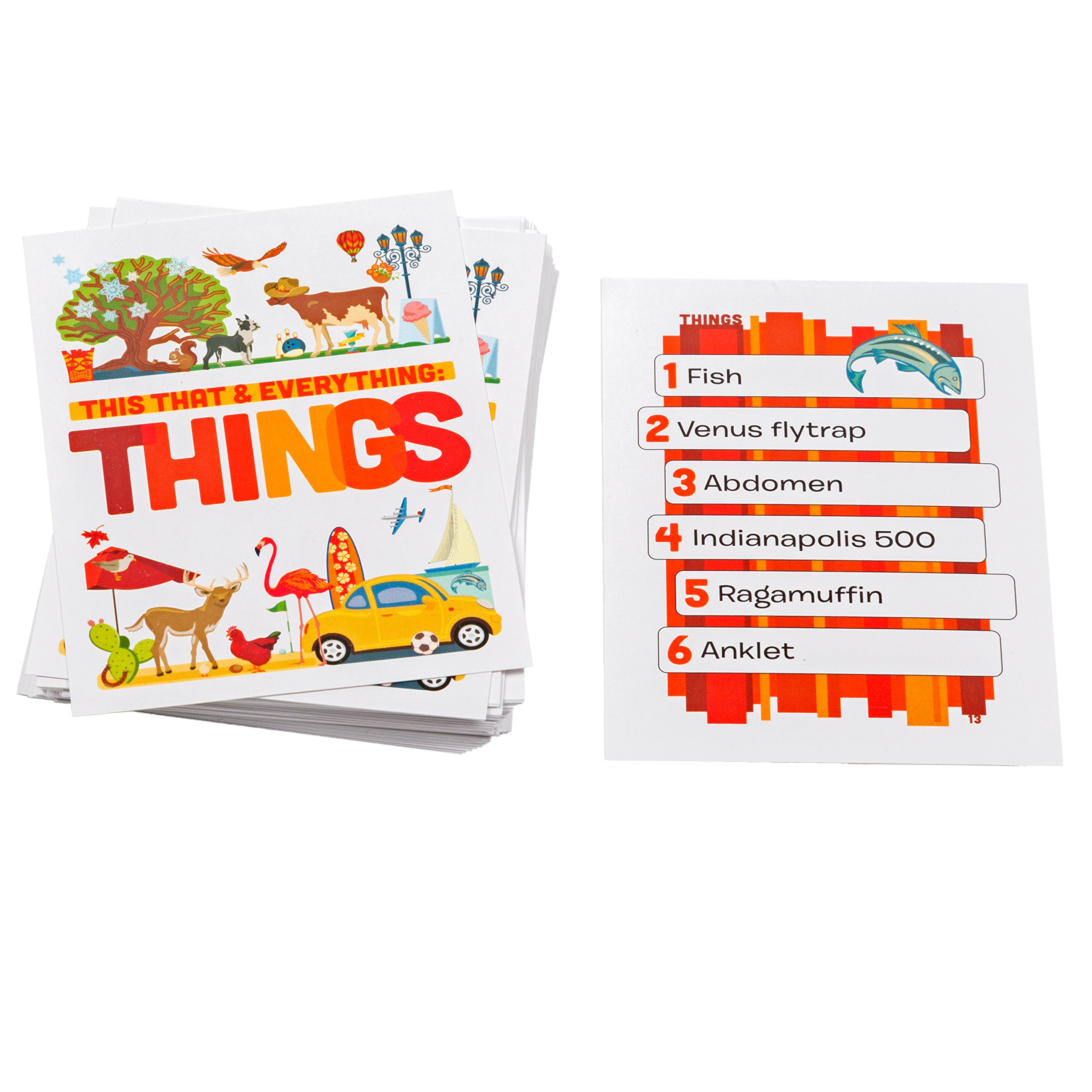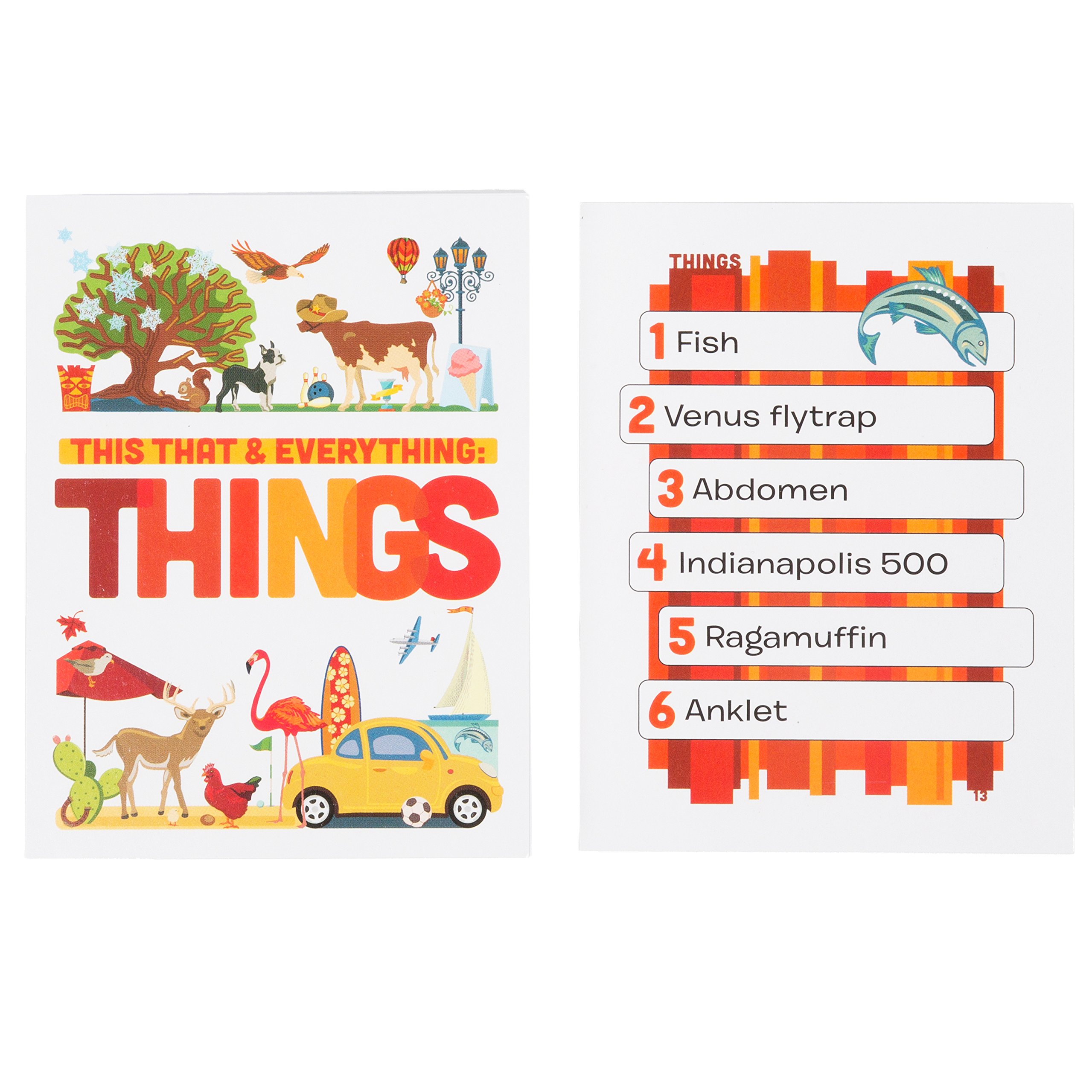 This that & everything: things card pack is the name-dropping party game that challenges players to describe things for their teammates. A random list of six items makes winning a challenge – so be ready to shout out this, that, and everything in between to earn the most points! this card game includes exclusive content not included in the big box game and it can be played on its own or as a supplementary pack.