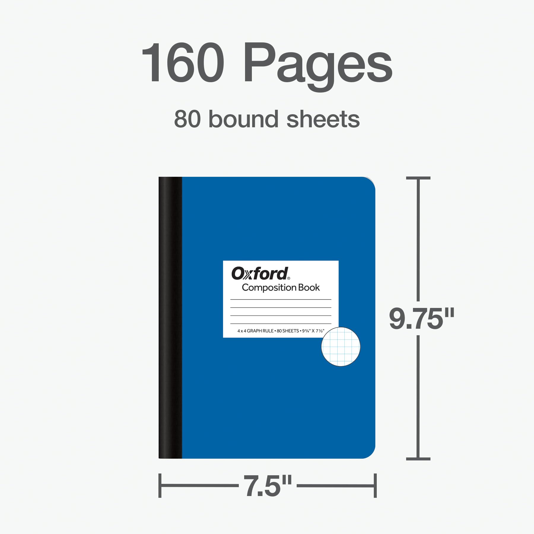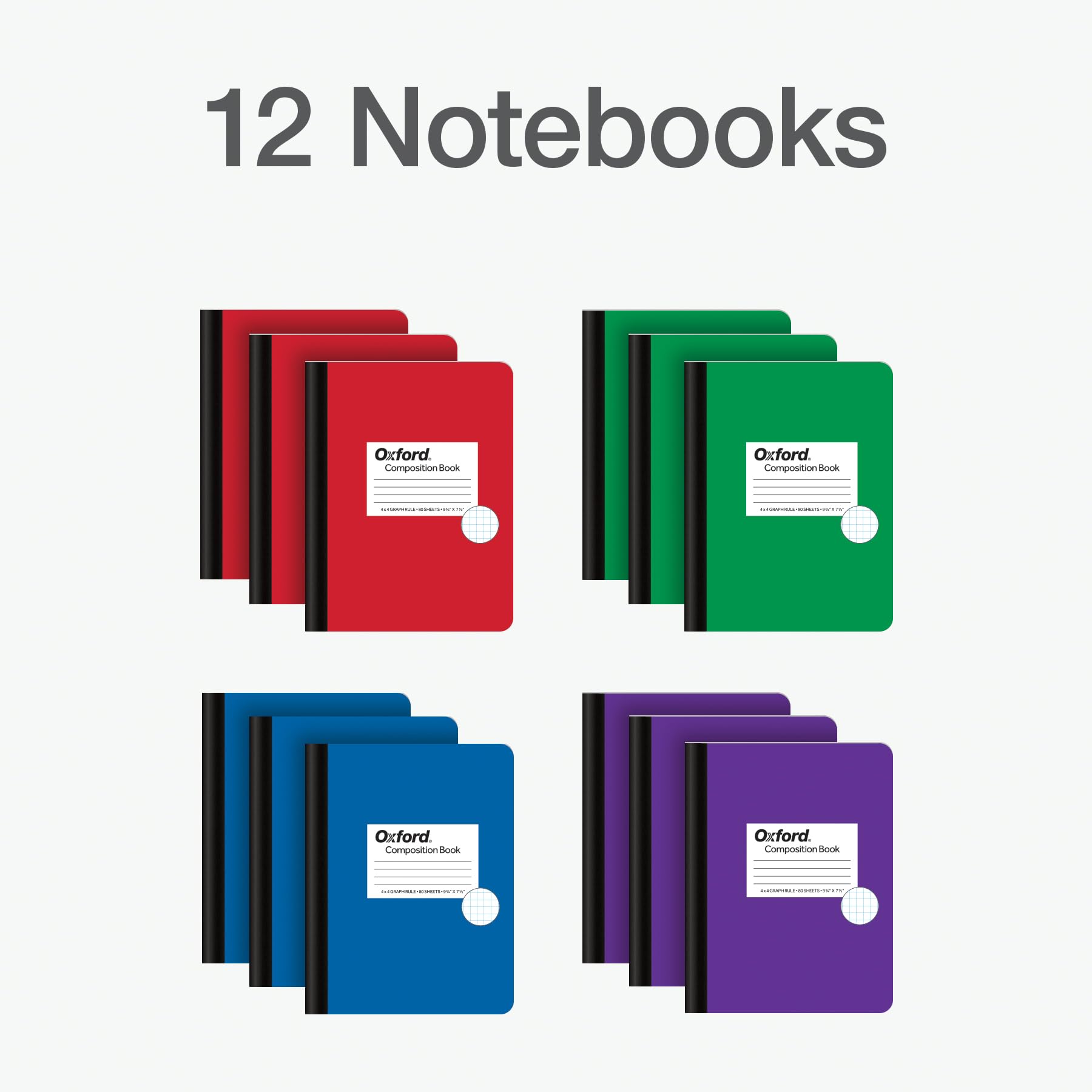 Oxford composition notebook bulk packs have 12 graph ruled notebooks with bright colored covers. You’ll get 3 green notebooks, 3 purple notebooks, 3 red notebooks, and 3 blue notebooks, so you can color code your classes, subjects or projects. Each has 80 double-sided sheets/160 pages of 4 x 4 graph ruled paper. Graph paper is ideal for math, art, engineering, architecture, science and more. Paper handles ink pens, colored pencils and highlighters for fun writing practice and beautiful charts. Center sewn pages make the composition notebook a teacher favorite. Creates a permanently bound journal, science notebook, bullet journal or writing notebook. Covers have a space for name and class, and a blank class schedule and conversion charts are inside. A great notebook for school! 4 x 4 graph ruled paper (4 squares per inch). 9-3/4″ x 7-1/2″. 80 Sheets/160 pages. Assorted color 12 pack: green, purple, blue, red.