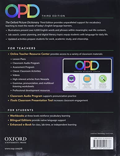 The third edition of the best-selling Oxford Picture Dictionary provides unparalleled support for vocabulary teaching to meet the needs of today’s English language learners. -4,000 English words and phrases with meaningful, real-life contexts presented within 12 thematic units, including Everyday Language, People, Housing, Food, and Recreation -New and updated topics such as job search, career planning, and digital literacy equip students with the language they need for everyday success. -Revised practice activities prepare students for work, academic study, and citizenship from the very beginning. -Pre-reading questions build students’ previewing and predicting skills -High-interest reading promote literacy skills -Post-reading questions support critical thinking and textual analysis. -Workbooks at three levels provide multilevel classroom support.