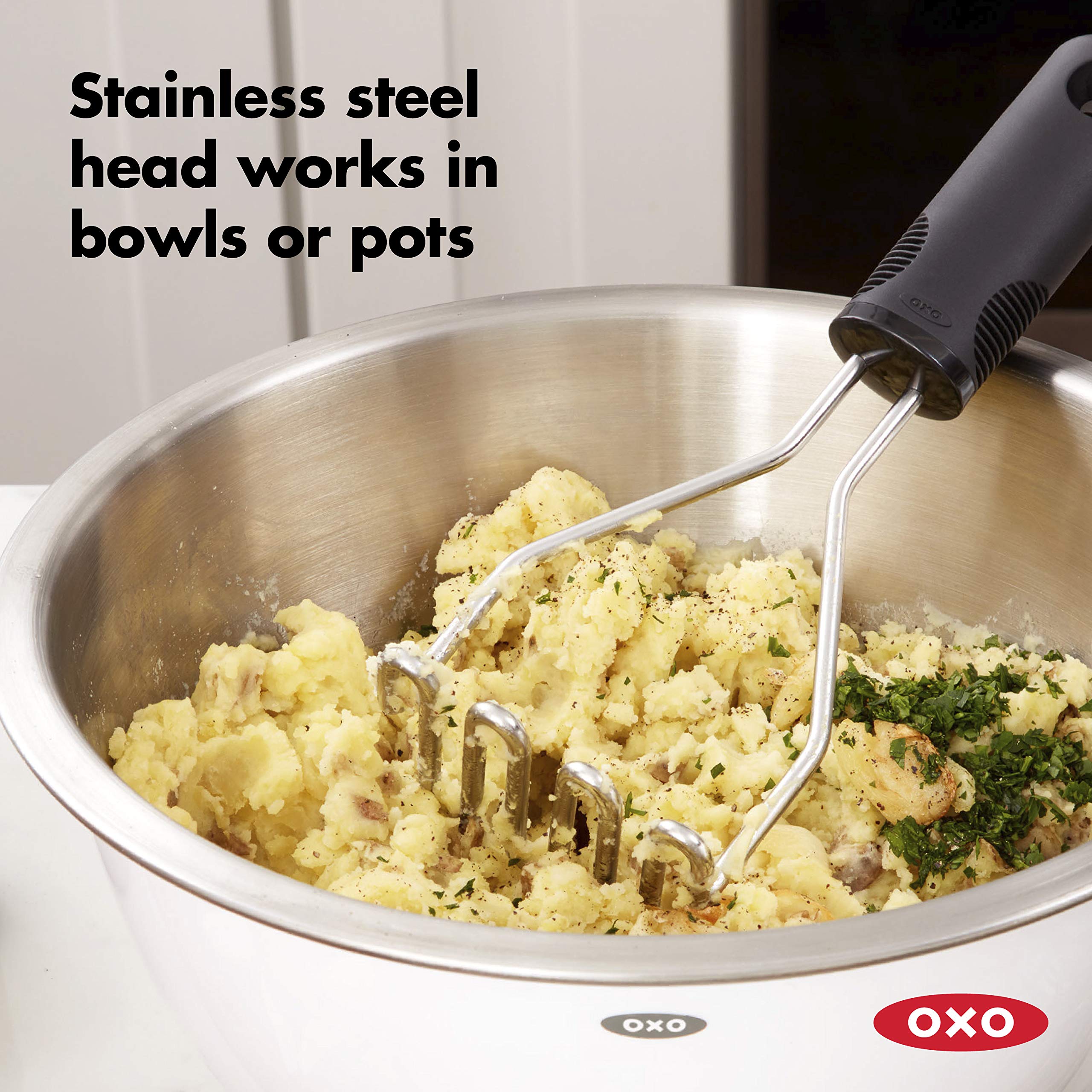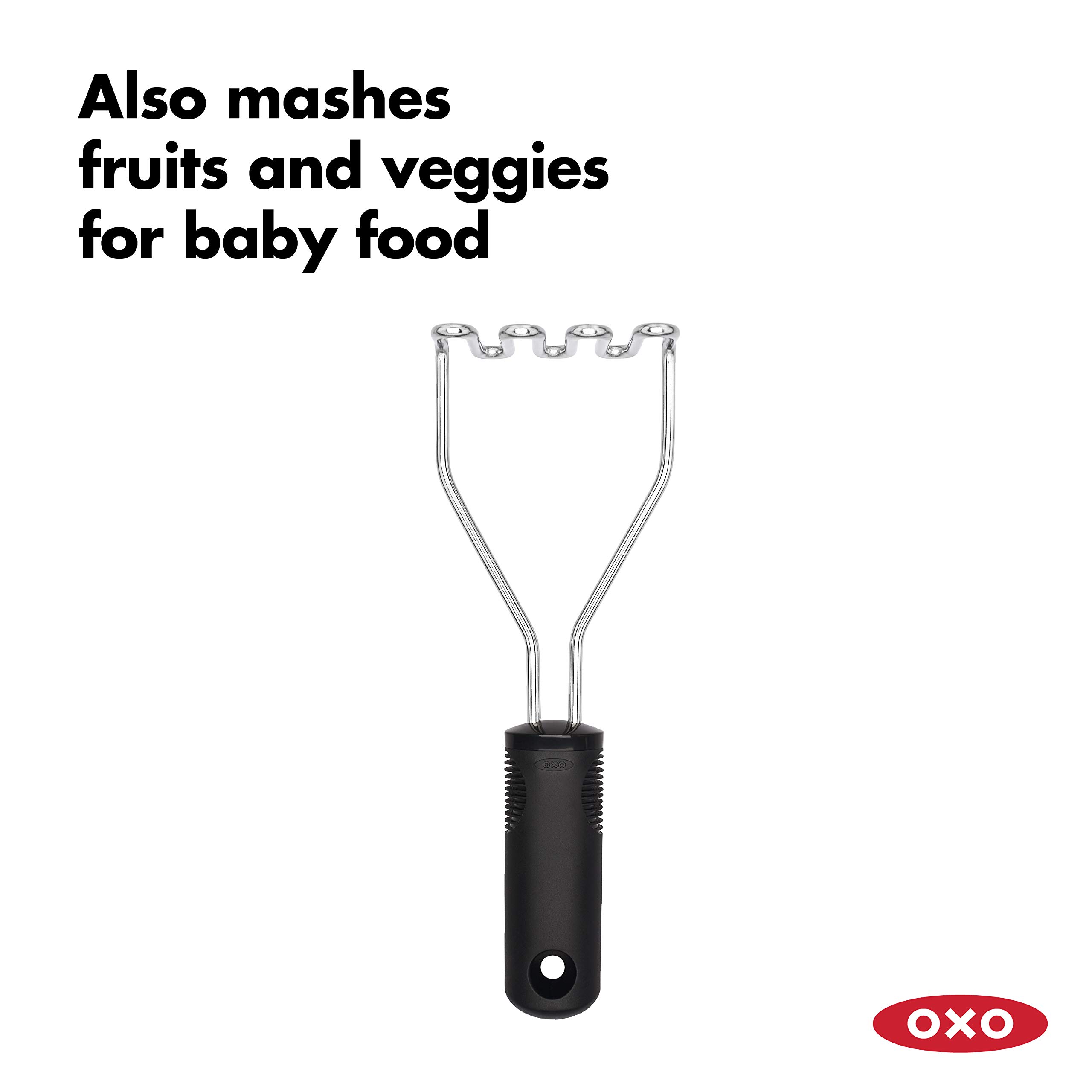 Amazon.com If you’re the kind of cook who prefers “mashed” to “whipped” potatoes, this tool may very well become your next best friend. With a stainless-steel wire head, the masher tackles the task at hand, all the while reducing pressure on your hands due to the soft, rubber cushioned handle that is nonslip, wet or dry. The wire masher works as well with yams, carrots, apples, or bananas, in case you’ve had oral surgery or have a baby in the house. Good Grips products are moderately priced and have won the Tylenol/Arthritis Foundation Design Award. –Laurie Notaro Product Description The OXO Good Grips Potato Masher features a Cushioned Handle that absorbs pressure while you work, plus a sturdy stainless steel wire head. The Masher is great for potatoes, yams, carrots and other root vegetables. Or use it to mash apples and bananas for homemade baby food. Large in-handle hole for hanging storage. Dishwasher safe.