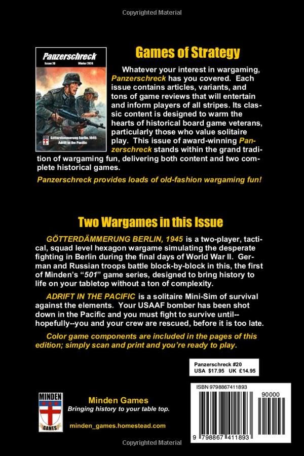 PANZERSCHRECK magazine issue #20, Winter 2024. Panzerschreck is a Charles S. Roberts award winning wargame publication, emphasizing high playability and fun in table top gaming. This 102-page edition has many game reviews, articles, an variants, plus two wargames included inside. GOTTERDAMMERUNG BERLIN, 1945 is a two-player, hexagon map wargame simulating the final days of fighting of World War II, in Berlin, between German and Russian troops. ADRIFT IN THE PACIFIC is a solitaire game of survival. Your USAAF bomber has been shot down over the Pacific, leaving you in a rubber raft and few supplies. Can you hold out until rescue? Editor: Gary Graber. Game Review Editor: Robert G. “Smitty” Smith. Historical Contributor: Robert Flood. Publisher: Minden Games.