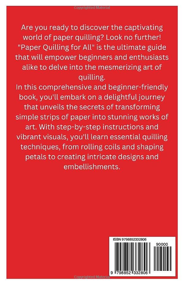 Are you ready to discover the captivating world of paper quilling? Look no further! “Paper Quilling for All” is the ultimate guide that will empower beginners and enthusiasts alike to delve into the mesmerizing art of quilling. In this comprehensive and beginner-friendly book, you’ll embark on a delightful journey that unveils the secrets of transforming simple strips of paper into stunning works of art. With step-by-step instructions and vibrant visuals, you’ll learn essential quilling techniques, from rolling coils and shaping petals to creating intricate designs and embellishments. Whether you’re a complete novice or an experienced quiller seeking fresh inspiration, “Paper Quilling for All” caters to your skill level. Discover a treasure trove of project ideas, including vibrant flowers, elegant monograms, whimsical animals, exquisite jewelry, and more. Unleash your creativity and watch as your quilled creations come to life. Inside “Paper Quilling for All,” you’ll find: An introduction to the art of paper quilling, including its history, materials, and tools needed to get started. Step-by-step instructions for fundamental quilling techniques, ensuring you have a solid foundation to embark on your artistic journey. Inspiring project ideas with clear instructions and colorful illustrations, allowing you to create beautiful and personalized quilled masterpieces. Tips, tricks, and troubleshooting guidance to help you overcome challenges and achieve stunning results. Creative variations and ideas to encourage experimentation and the development of your unique quilling style. With its accessible approach and comprehensive content, “Paper Quilling for All” makes the art of quilling accessible to everyone. Immerse yourself in the joy of creating intricate and captivating designs that will impress friends, family, and even yourself! Unleash your creativity, learn the art of quilling, and embark on an extraordinary journey with “Paper Quilling for All.” Let the beauty of paper and your imagination come together to create stunning quilled artworks that will leave a lasting impression. Get ready to embrace the artistry of quilling and discover the endless possibilities that await you! ORDER YOUR COPY NOW