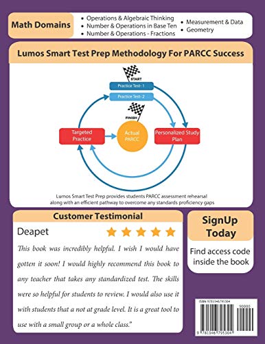 Why Lumos PARCC Test Prep Workbook? Grade 5 Math PARCC Assessment Test Prep Printed Workbook (updated for 2023-24), designed by expert educators to help students succeed on PARCC test. The Lumos PARCC Math test prep workbook for grade five offers rigorous standards-aligned practice resources. It helps identify grade-level & foundational skill gaps in Math standards, which allows them to become proficient in critical Math standards to improve PARCC scores. It also helps eliminate test anxiety & boost student confidence by providing online access to the realistic PARCC testing environment. Recommended by Teachers, Trusted by Parents “My fifth grader really enjoyed this book, was really helpful in reviewing all the topics before PARCC.” – Ravi PARCC Test Prep Workbook for Mathematics: This standards-based workbook provides an efficient pathway for 5th graders to be better prepared for PARCC. 5th Grade Mathematics Workbook for PARCC Practice Covers: Complete Fifth Grade Math standards practice Operations & Algebraic Thinking Number & Operations in Base Ten Number & Operations – Fractions Measurement and Data Geometry Detailed answer keys & explanations Gain mastery on critical Math standards Easy to read real-time performance reports Strategies to improve test speed & accuracy Online Learning Resources Unlocked Through Access Code: Unlike a traditional printed book, these workbooks provide online access to hundreds of standards-aligned fun & engaging learning resources. Access to 2 full-length practice tests that mimic the PARCC blueprint Allows personalized automated remediation powered by AI Lumos Assistant offers an individualized learning path for students Access to Lumos mind-maps & flashcubes Access to all PARCC question types Conveniently access online resources, anywhere, anytime. For Students: Two online practice tests that mimic the grade 5 PARCC Math test Practice PARCC Tech-enhanced Items Additional Math practice with released PARCC exemplars Realistic PARCC testing environment For Parents: Performance reports to monitor learning progression Reduced parent intervention Analyze child’s strengths and weaknesses with standards-based reports Benefits for Teachers: Access to teaching resources to boost grade 5 Math scores Deliver personalized instruction & provide targeted support with an AI-powered deep remediation tool Additional test practice with released Grade 5 Math items by PARCC Smart Test Prep Methodology(tm) for Success on PARCC Assessments With over a decade of experience developing practice resources for standardized tests, Lumos Learning Smart Test Prep Methodology(tm) offers students realistic PARCC practice & the tools to overcome proficiency gaps. Lumos Learning Study Programs are trusted by 510,000+ Students, 74,500+ Teachers, 35,000+ Schools, & 100+ Libraries to improve student achievement on standardized tests. The Lumos PARCC Test Practice workbook is ideal for At-Home Learning, Classroom Learning, Home Tutoring & Home Schooling. With this workbook at your side, your child will be better prepared & confident for the 2023-24 PARCC test prep. Give your student the Lumos tedBook advantage today!