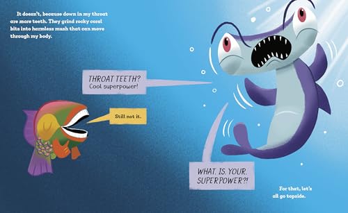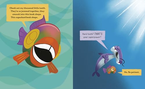 A factual (and funny) introduction to the parrotfish and its incredible somewhat-squirmy superpower, from the team that brought you Stinkbird Has a Superpower. Just wait till you hear what a parrotfish can do! You may know they live in warm tropical waters, have an interesting trick for hiding from predators, and have crazy-incredible teeth. But they also do something that no other fish can do–and Parrotfish is eager to tell you all about it. There’s just one problem–nosy Hammerhead Shark keeps interrupting to talk about himself. But even Hammerhead gets intrigued and bellows, “WHAT. IS. YOUR. SUPERPOWER!!” Want to know what it is? Read this book! Reader beware: you may never look at a day at the beach the same way again.