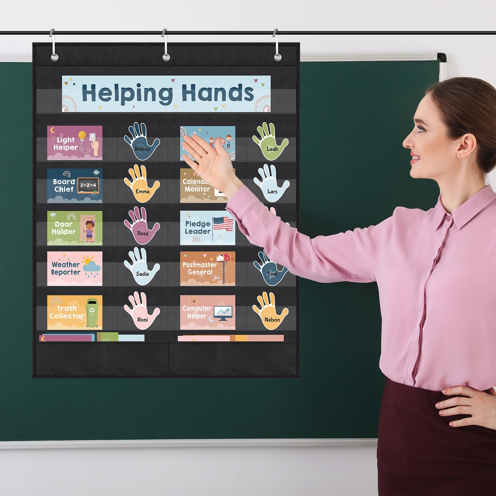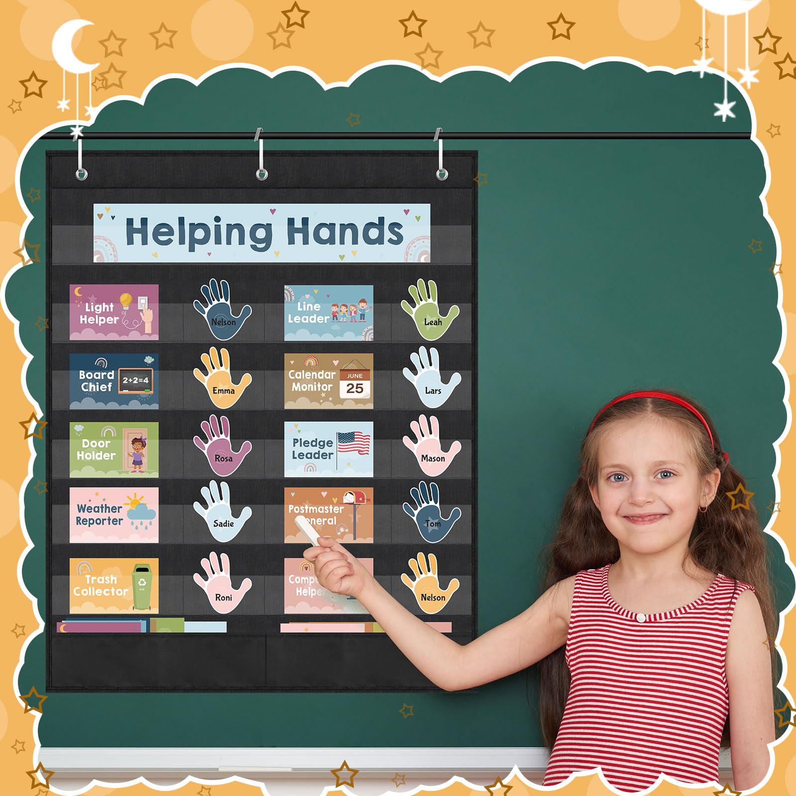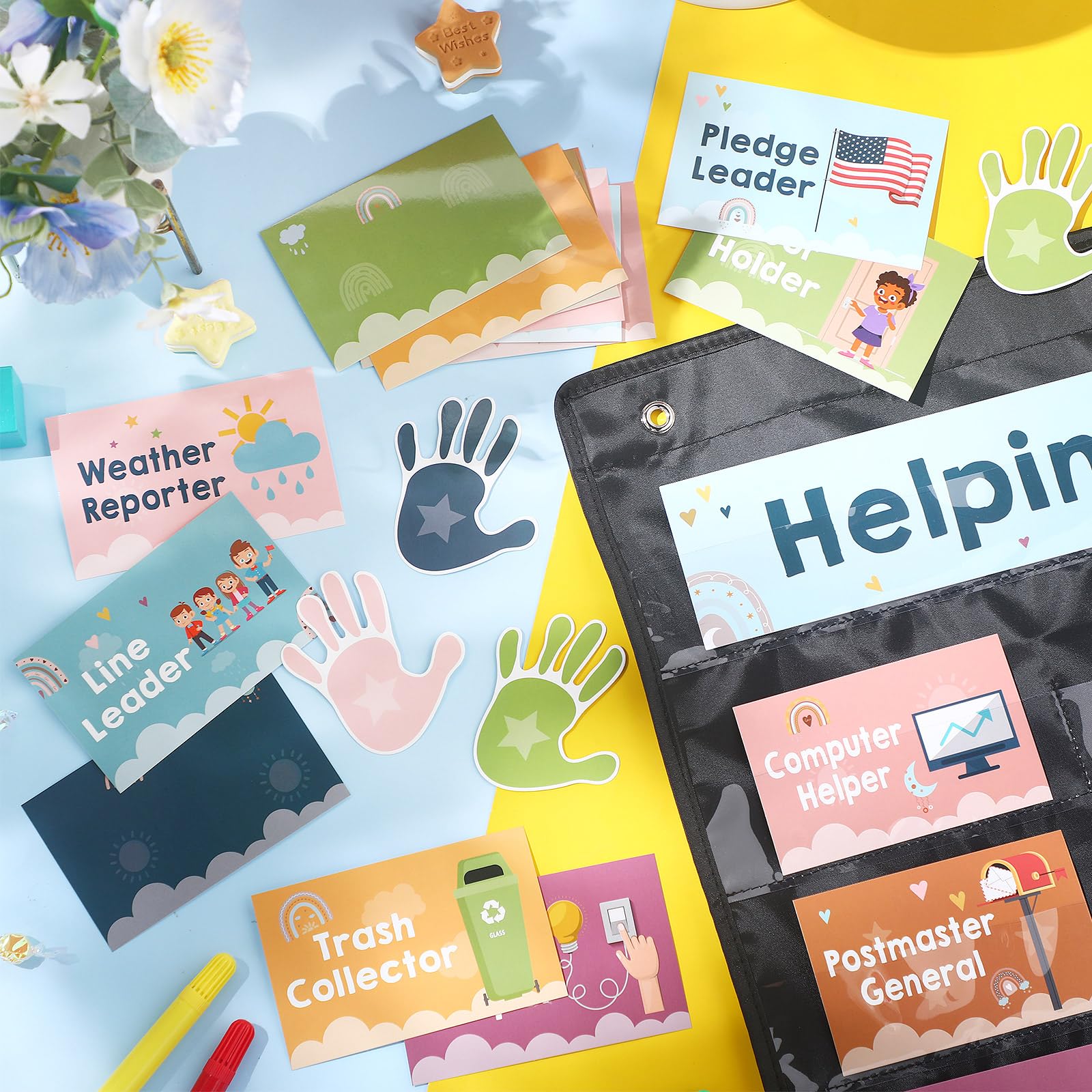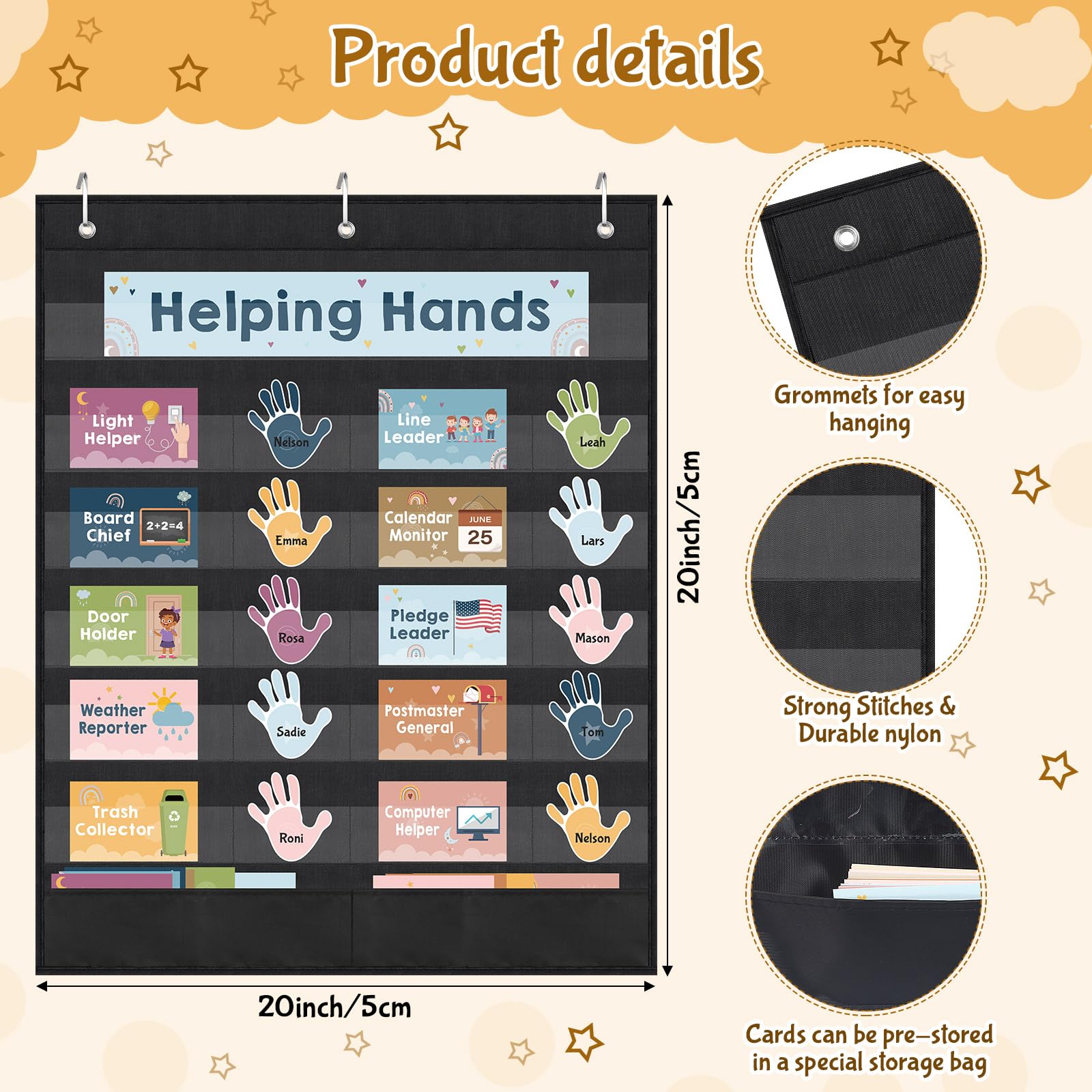 - Classroom Pockets Chart Set: you will receive 65 pocket chart supplies, including 1 helping hands pocket chart, 3 hooks, and 62 classroom jobs cards; Sufficient quantity to meet your diverse classroom activity needs, practical work cards and palm cards ideal for school and home use