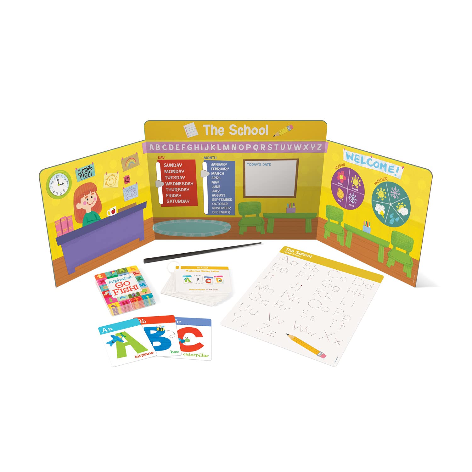 Get little ones ready for kindergarten fun with this learning kit! Parents can follow the included guide to help them practice using important kindergarten tools like pencils, scissors, die and dry eraser boards. Early learners will also be introduced to beginning math skills and build fine motor skills as they visit fun places around town: Donut Shop, Post Office, Vet and School!