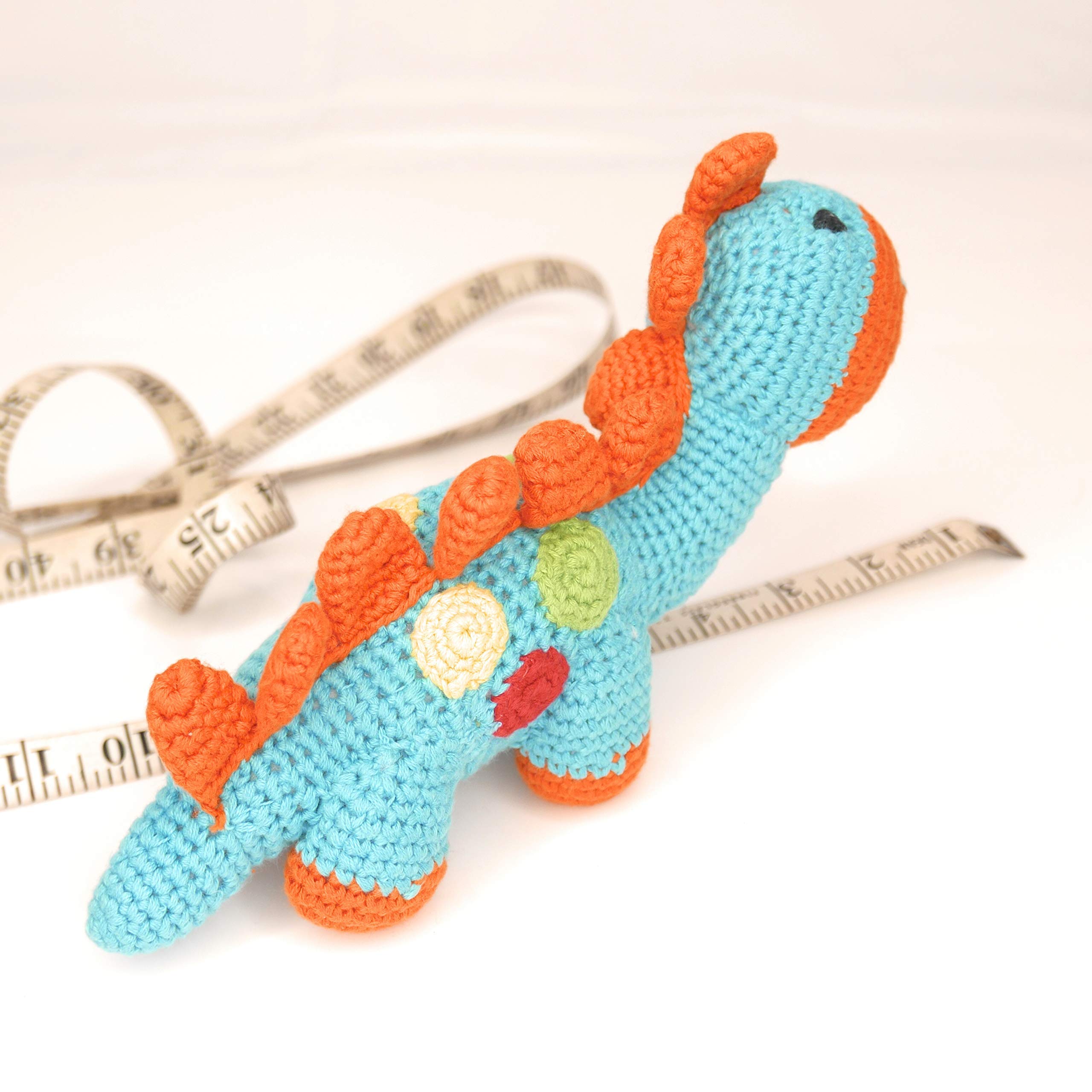 PEBBLE Dinosaur Rattle – Steggi Turquoise– Let your child’s imagination wander back to prehistoric times with this darling stegosaurus rattle. Bright turquoise with soft orange pointy spikes and green, red and yellow polka dots, this timeless handmade dinosaur toy makes a delightful gift for a baby shower or baby’s first birthday. Pebble– “Putting smiles on faces around the world!”