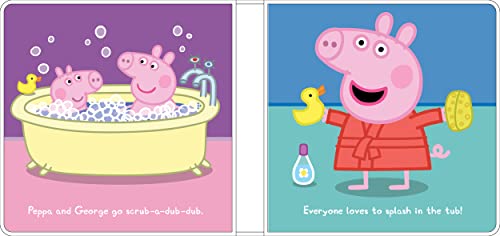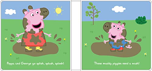 Take to the tub with this silly bath book featuring Peppa Pig and her little brother George! After splish, splash, sploshing in muddy puddles, these muddy piggies need a bath. Babies and toddlers will love reading and playing with this waterproof book that floats in the bathtub. This bath book is special because Makes bath time fun for your little one Soft pages are durable and easy to clean Includes amazing Peppa Pig characters: Peppa, George, and Daddy Pig