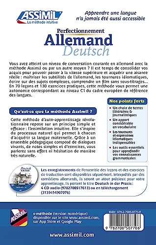 Apprendre une langue n’a jamais ete aussi accessible . Perfectionnement . Allemand . Deutsch . Vous avez atteint un niveau de conversation courante en allemand avec la methode Assimil ou par un autre moyen ? Il est temps de consolider vos acquis pour pouvoir passer a la vitesse superieure et acquerir une aisance reelle : maitriser les subtilites de l’allemand, les tournures idiomatiques, ecrire sur des sujets complexes, comprendre un film sans sous-titrages… En 70 lecons et 130 exercices pratiques, cette methode vous permet une autonomie correspondant au niveau C1 du cadre europeen de reference des langues.. Qu’est-ce que la methode Assimil ? . Cette methode d’auto-apprentissage revolutionnaire repose sur un principe simple et efficace : l’assimilation intuitive. Elle s’inspire du processus naturel qui permet a chacun d’acquerir sa langue maternelle. Grace a un ensemble pedagogique compose de dialogues vivants, de notes simples et d’exercices, vous parlerez sans effort ni hesitation de maniere tres naturelle.. Nos points forts . $? Un choix de textes litteraires et journalistiques. $? Un apport considerable en vocabulaire. $? Les tournures et expressions idiomatiques indispensables. $? Les outils essentiels pour approfondir vos connaissances grammaticales.
