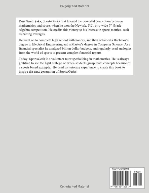 If your child says “learning about perimeters, areas, and volumes is no fun … I am more interested in sports”; this book could be a game changer. Besides showing how these measurements are used throughout the word of sports, this book answers some fun questions like: How many basketballs can fit through a hoop at the same time? How many clay bricks are needed to build a batter’s box? How many gallons of liquid will I be pouring my coach’s head after a win? Just imagine all the fun your child will have sharing these fun trivia questions with friends! Examples and word problems draw from a range of sports so your young sports fan will be able to see the application of these math subjects in their favorite sports. Chapters cover the following topics: Perimeter of Common Polygons Area of Common Polygons Perimeter of Circular Objects Area of Circular Objects Volume of Prisms and Cylinders Surface Area of Prisms and Cylinders Volume of Spheres Surface Area of Spheres This workbook is intended to supplement text books used to teach these topics and includes over 300 sports based word and supplemental problems. Step by step solutions, not just answer keys, are included for every problem. Imagine sprinkling sports trivia with sports-based problems – and that’s a Math recipe which is sure to appeal to students in Grades 5 to 8.