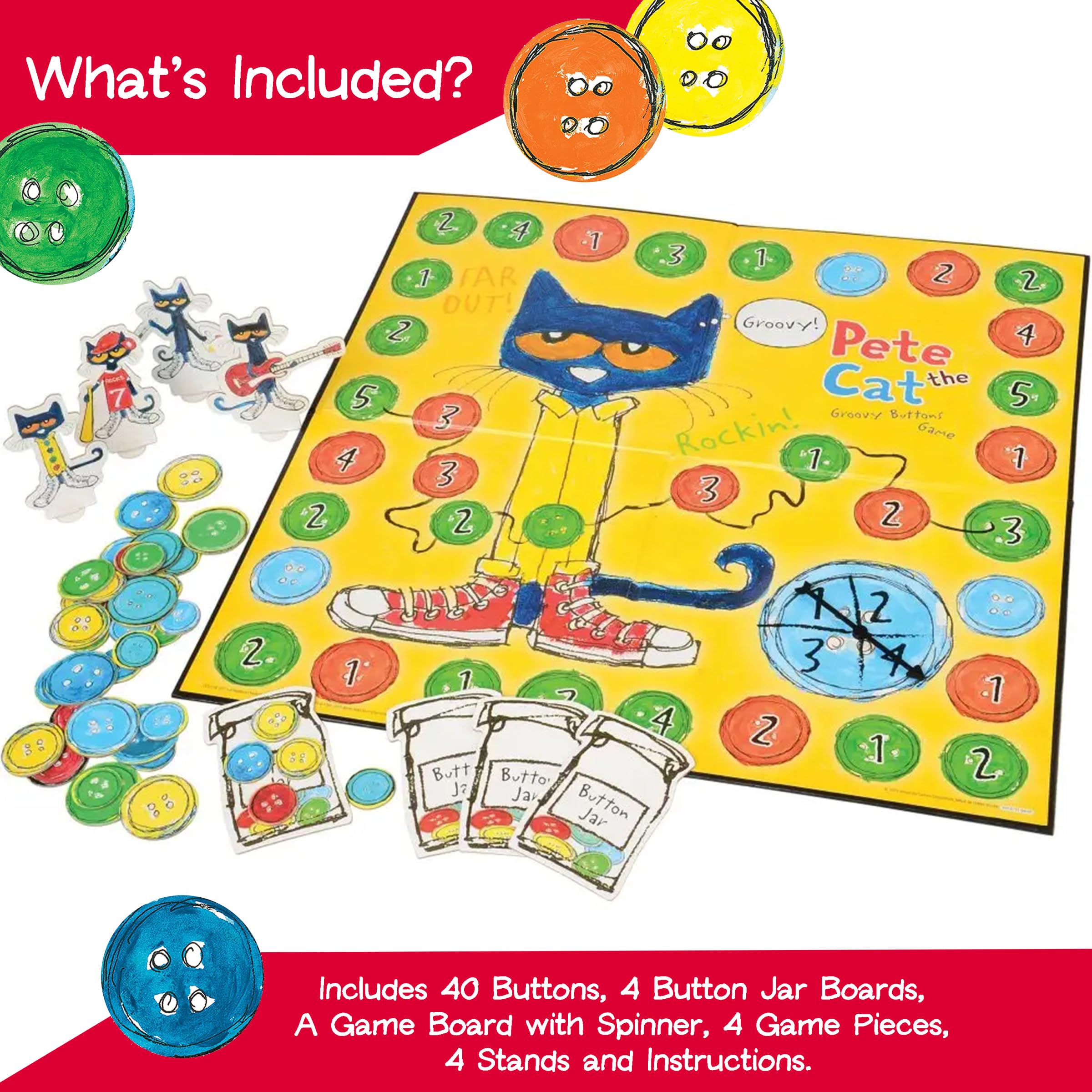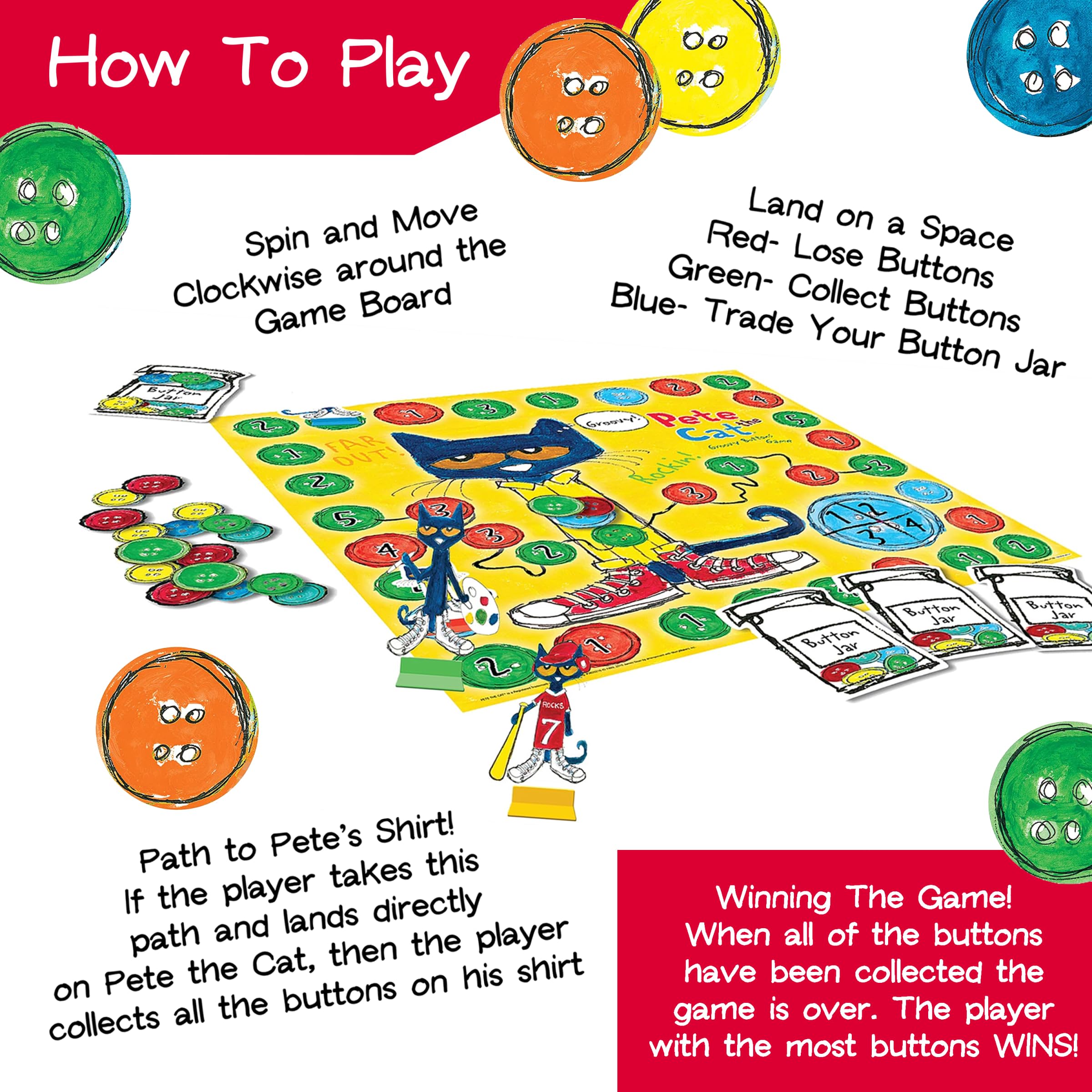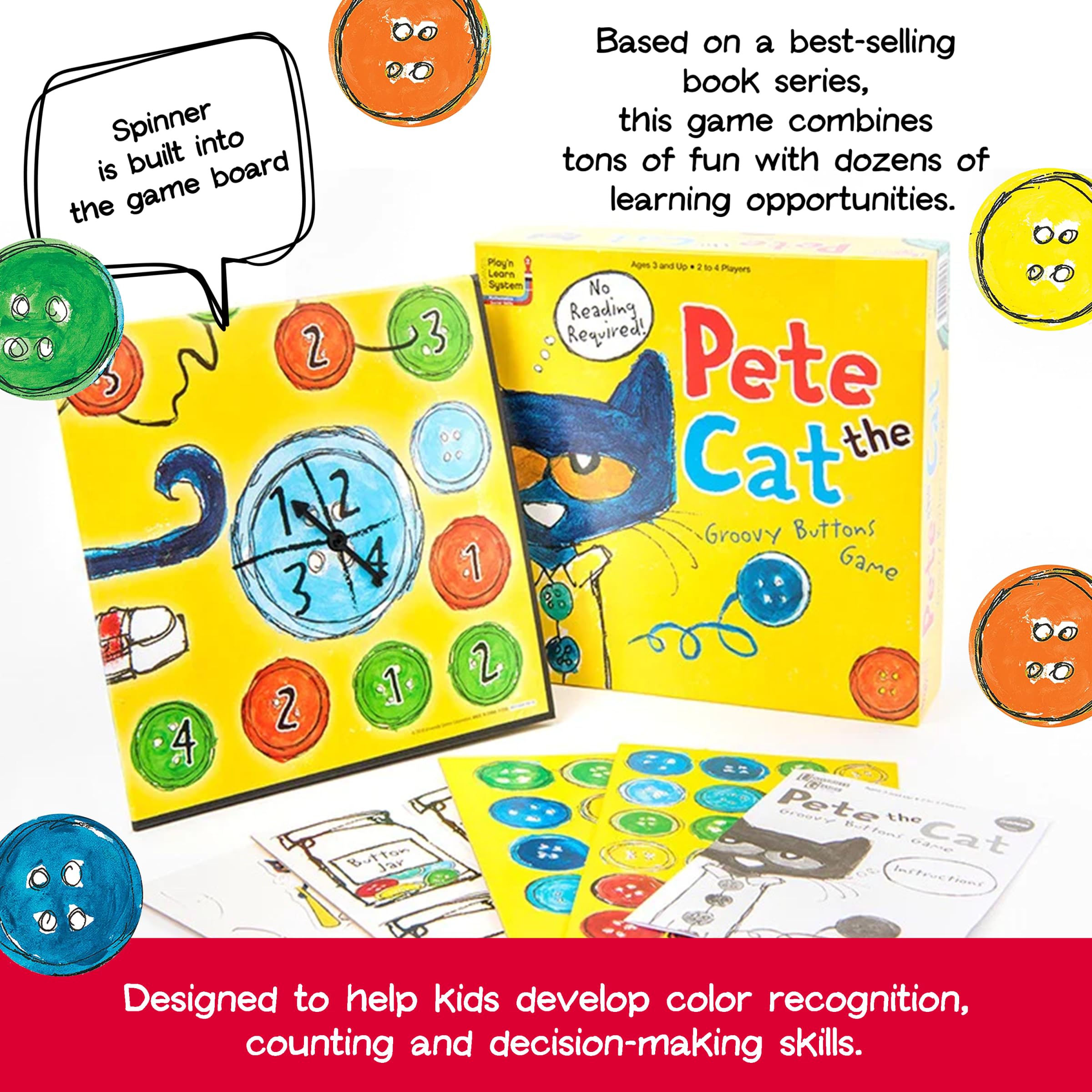 Pete the Cat is the coolest cat ever. Based on the best-selling book series, our Pete the Cat games introduce kids to simple learning concepts wrapped up in fun games. Kids learn color recognition, counting, and decision-making skills. Kids keep on movin’ and groovin’ with Pete the Cat. Contains 40 buttons, 4 button jar boards, game board with spinner, 4 game pieces, 4 stands, and instructions. University Games’ Briarpatch division is America’s leading preschool game and puzzle line, with 20 years of innovative and exceptional learning games.