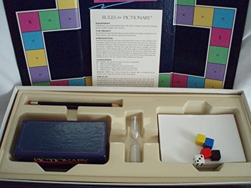 PICTIONARY: UPDATED FOR THE 90’S. Contents: gameboard, die, timer, 500 cards with 4 category cards, 4 pencils, 4 playing pieces, 4 pads of paper, storage tray and instructions. Copyright 1993 Pictionary Inc, A Milton Bradley Game.