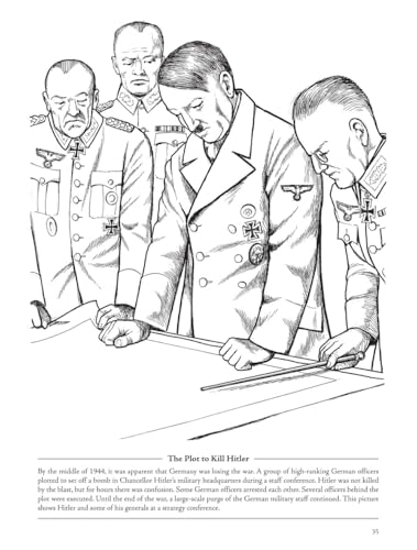 Dramatic illustrations capture air, land, and sea battles plus other major events — from the German invasion of Poland in 1939 to the Japanese surrender in 1945 during World War ll. The most destructive war in history, World War II involved intense conflict in Europe as well as Asia, Africa, and the South Pacific. Peter F. Copeland’s forty-five ready-to-color illustrations include the Battle of Britain, the Japanese attack on Pearl Harbor, General Rommel’s desert campaigns, the sinking of the German battleship Bismarck, the Battle of Stalingrad, the Allied invasion of France, the fall of Berlin, the battles of Iwo Jima and Okinawa, and the dropping of the atomic bomb over Hiroshima. An informative caption accompanies each powerful, meticulously rendered illustration. Learn about the most destructive and deadly conflict in history, World War II, from the German invasion of Poland in 1939 to the Japanese surrender in 1945. Forty-five ready-to-color scenes capture air, land, and sea battles plus other major events, including the Battle of Britain, the Japanese attack on Pearl Harbor, the Battle of Stalingrad, the Allied invasion of France, the battles of Iwo Jima and Okinawa, and the dropping of the atomic bomb over Hiroshima. Color and learn about the roles of Hitler, Mussolini, Rosie the Riveter, Stalin, US President Franklin D. Roosevelt, Winston Churchill, and others. Each image is accompanied by a fact-filled descriptive caption. Add color to the striking scenes with pencils, pens, or crayons. A valuable resource for parents, teachers, librarians, homeschoolers, and history buffs ages 9 and up.