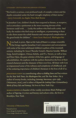 Jonathan Cott’s reflections and conversations with six celebrated children’s authors–now in a new edition Pipers at the Gates of Dawn is a unique ensemble bringing together Jonathan Cott’s encounters and conversations with some of the most celebrated children’s authors of the twentieth century. “Children’s literature,” he states, “brings us back to experiencing our earliest and deepest feelings and truths. It is our link to the past and a path to the future. And in it we find ourselves.” Cott’s firm belief is that children’s literature can impart wisdom and delight to everyone, and he believes that the masterpieces of children’s literature are simply masterpieces of literature in miniature, conveyors of wisdom and wonder. Pipers at the Gates of Dawn consists of Cott’s essay-interviews with Dr. Seuss (Theodor Geisel), Maurice Sendak, William Steig, Astrid Lindgren, Chinua Achebe, P. L.Travers, and with Iona and Peter Opie, the great scholars of the lore, games, and language of schoolchildren. He explores with the authors themselves the lives of their created characters and the character of their own lives. All share with Cott an impassioned sense of the richness and complexity of childhood, and of the enduring importance of children’s literature in the lives of all of us.