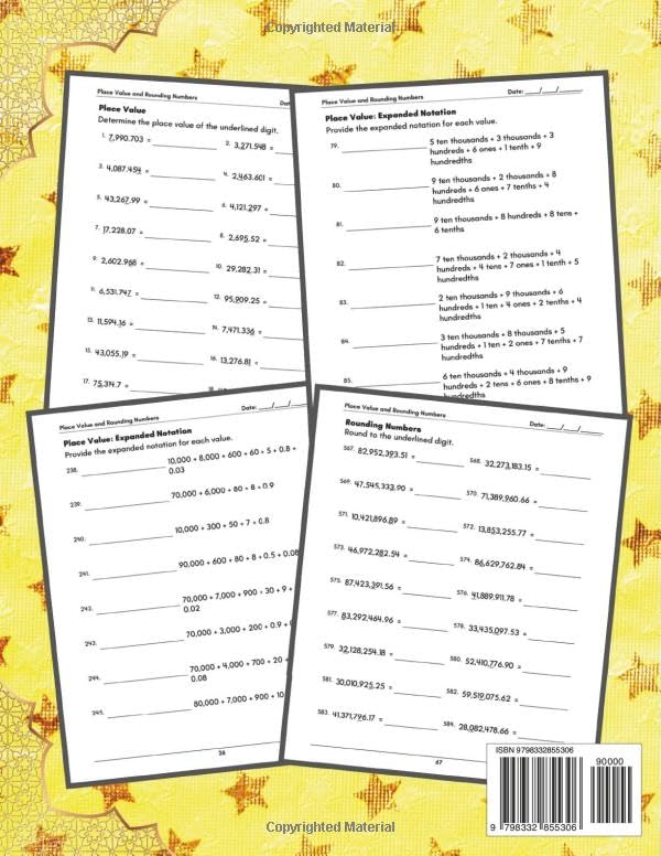 Boost your child’s math skills with the comprehensive Place Value and Rounding Math Workbook for Grades 3 to 6. This workbook offers a wide range of engaging practice worksheets focused on understanding place value, working with numbers in words and standard form, expanded notations, and rounding numbers. Key Features: Comprehensive Practice: This workbook covers key concepts such as place value, converting numbers between words and standard form, expanded notations, and rounding numbers. Each section is designed to reinforce critical math skills and build a strong mathematical foundation. Skill-Building Opportunities: Provides ample practice problems to help students master place value, rounding numbers, and understanding expanded notations. These skills are crucial for academic success and everyday life. Clear Instructions: Easy-to-follow instructions ensure that students can work through each worksheet independently, promoting self-paced learning and comprehension. Grade-Appropriate Content: Specifically designed for students in grades 3 to 6, aligning with curriculum standards and educational objectives. Perfect for use in the classroom, homeschooling, or for additional practice at home. The Place Value and Rounding Math Workbook for Grades 3 to 6 is more than just a collection of worksheets; it is a tool for building confidence and competence in essential math skills. Whether used in the classroom or at home, this workbook supports ongoing learning and prepares students for more advanced math challenges.