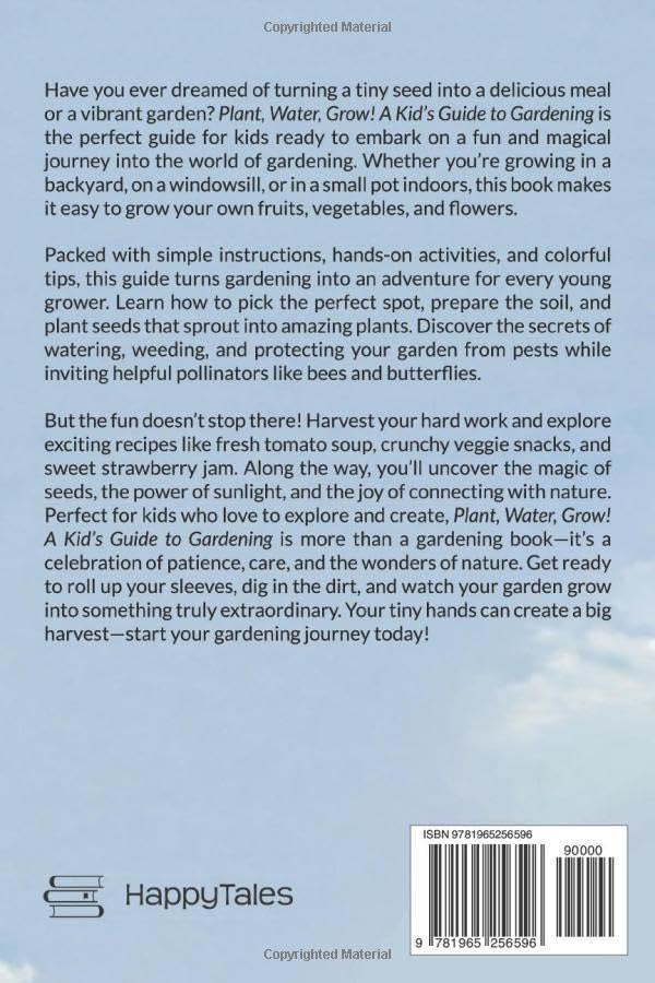 Have you ever dreamed of turning a tiny seed into a delicious meal or a vibrant garden? Plant, Water, Grow! A Kid’s Guide to Gardening is the perfect guide for kids ready to embark on a fun and magical journey into the world of gardening. Whether you’re growing in a backyard, on a windowsill, or in a small pot indoors, this book makes it easy to grow your own fruits, vegetables, and flowers. Packed with simple instructions, hands-on activities, and colorful tips, this guide turns gardening into an adventure for every young grower. Learn how to pick the perfect spot, prepare the soil, and plant seeds that sprout into amazing plants. Discover the secrets of watering, weeding, and protecting your garden from pests while inviting helpful pollinators like bees and butterflies. But the fun doesn’t stop there! Harvest your hard work and explore exciting recipes like fresh tomato soup, crunchy veggie snacks, and sweet strawberry jam. Along the way, you’ll uncover the magic of seeds, the power of sunlight, and the joy of connecting with nature. Perfect for kids who love to explore and create, Plant, Water, Grow! A Kid’s Guide to Gardening is more than a gardening book–it’s a celebration of patience, care, and the wonders of nature. Get ready to roll up your sleeves, dig in the dirt, and watch your garden grow into something truly extraordinary. Your tiny hands can create a big harvest–start your gardening journey today!