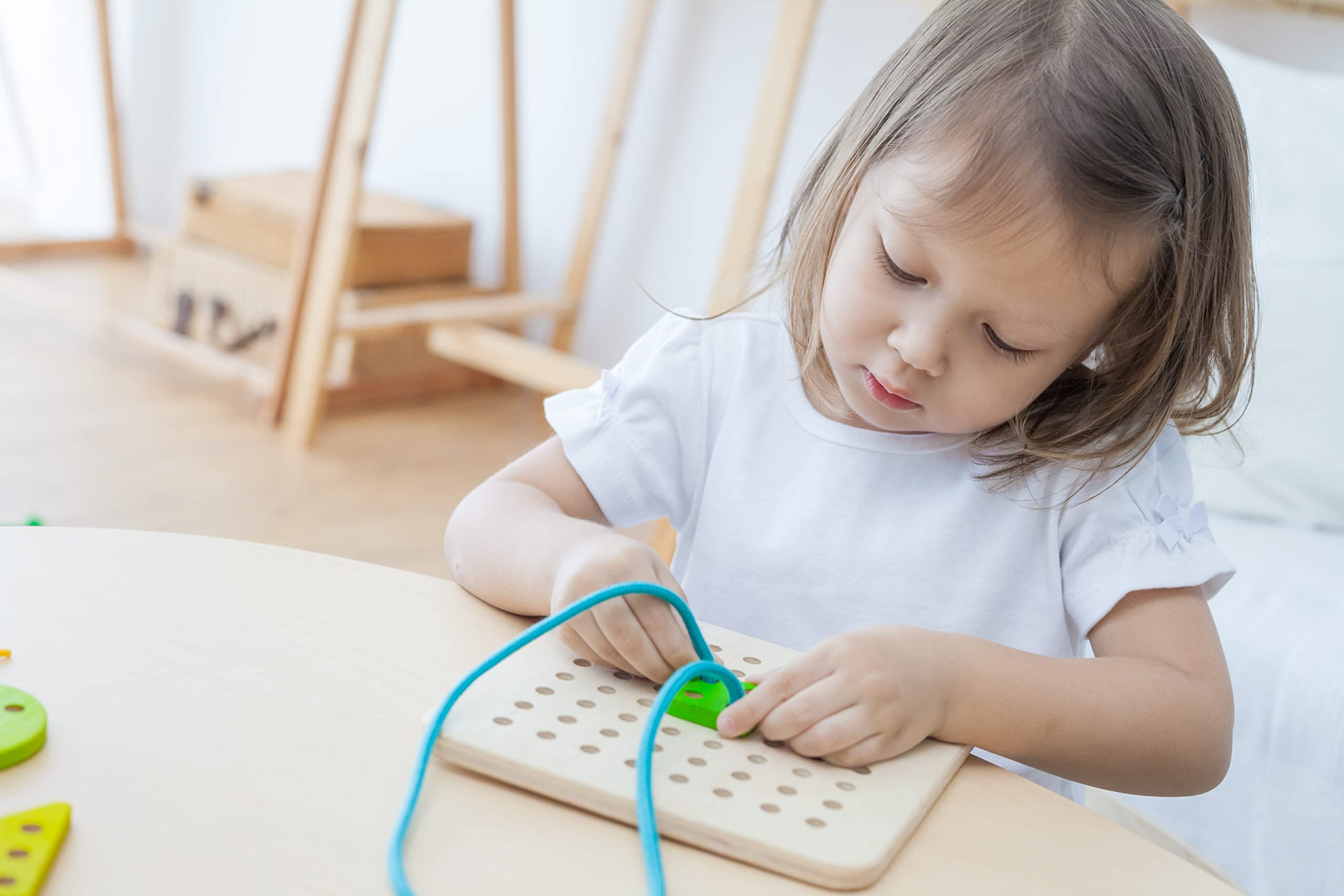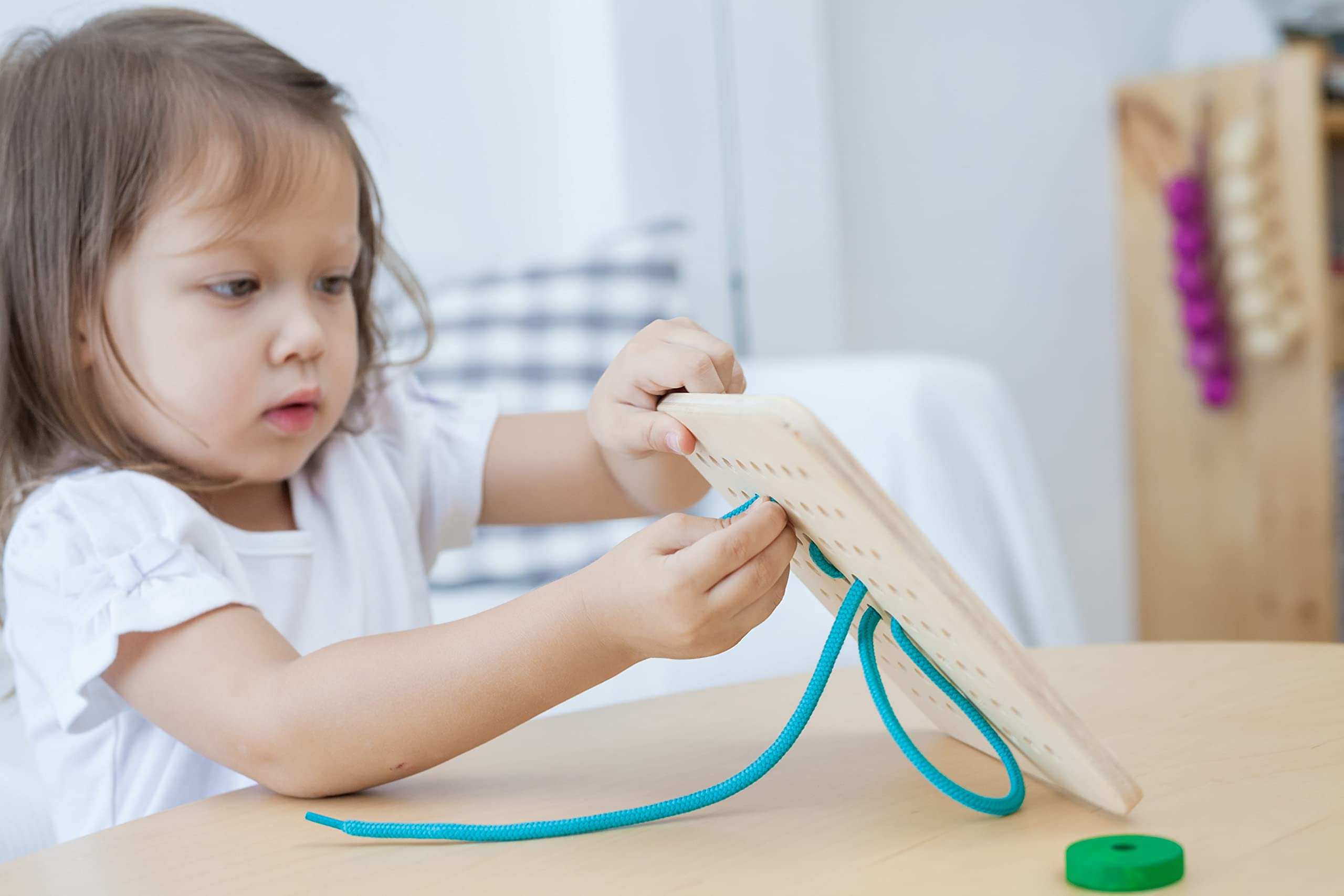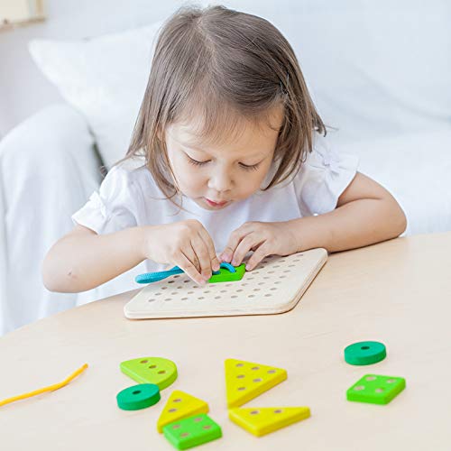 - Helps teach motor skills and hand eye coordination^Promotes creativity^Solid wood pieces and quality laces