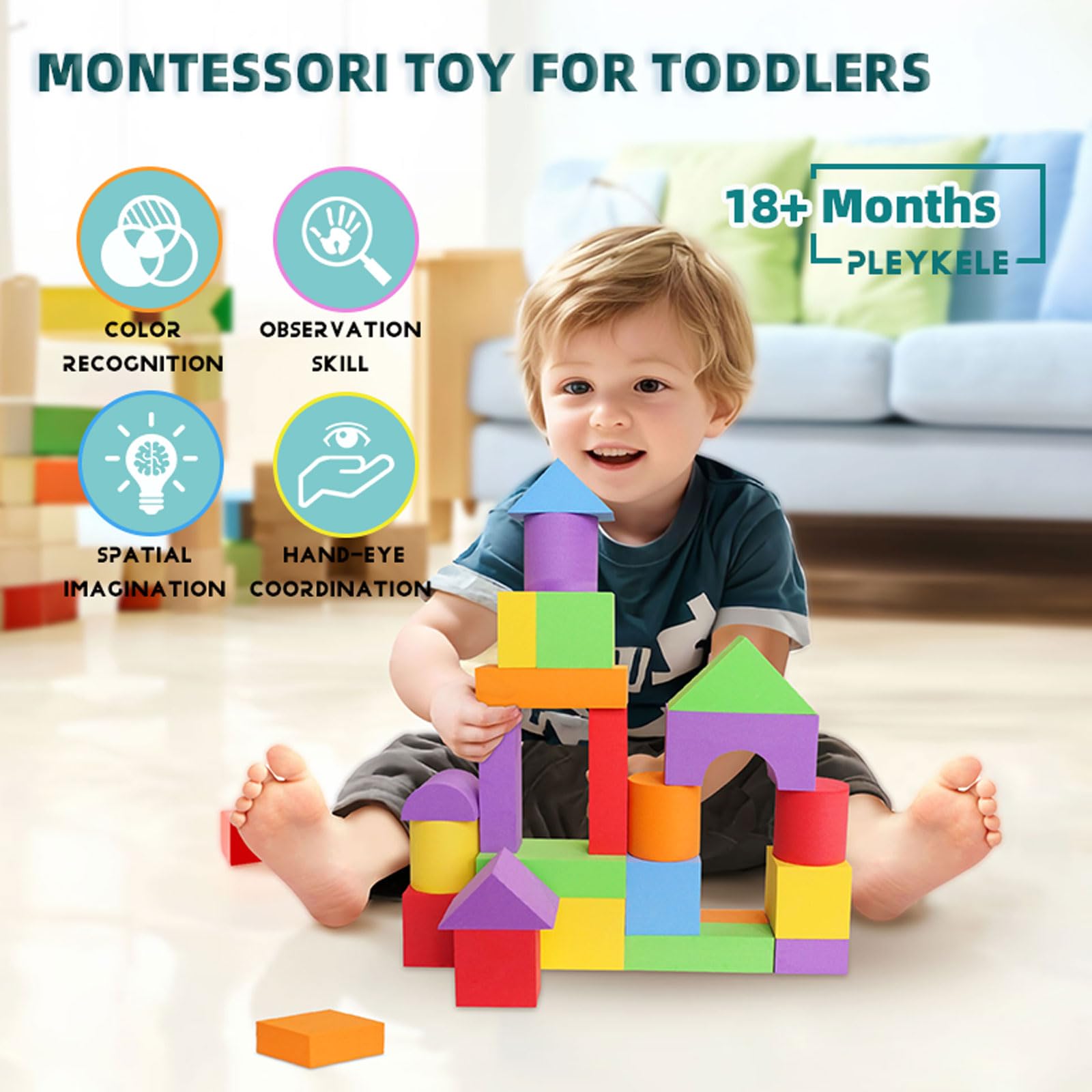 Pleykele Suitable Size Foam Building Blocks for Toddlers 18M+, Big Soft Stacking Blocks Toys, Baby Bath Toys, Sensory & Early Development Toys for Kids 1.5 Years Up (Starter Kit)