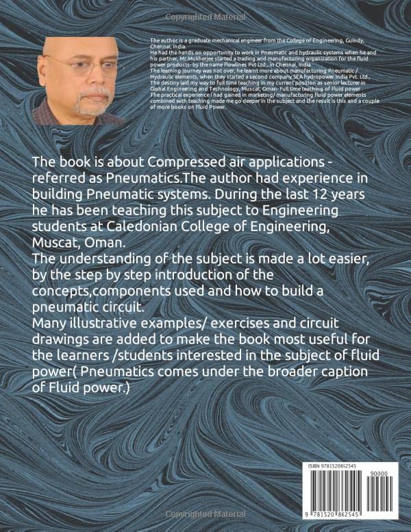 The book is about Compressed air applications – referred as Pneumatics.The author had experience in building Pneumatic systems. During the last 12 years he has been teaching this subject to Engineering students at Caledonian College of Engineering, Muscat, Oman.The understanding of the subject is made a lot easier, by the step by step introduction of the concepts,components used and how to build a pneumatic circuit.Many illustrative examples/ exercises and circuit drawings are added to make the book most useful for the learners /students interested in the subject of fluid power( Pneumatics comes under the broader caption of Fluid power.)