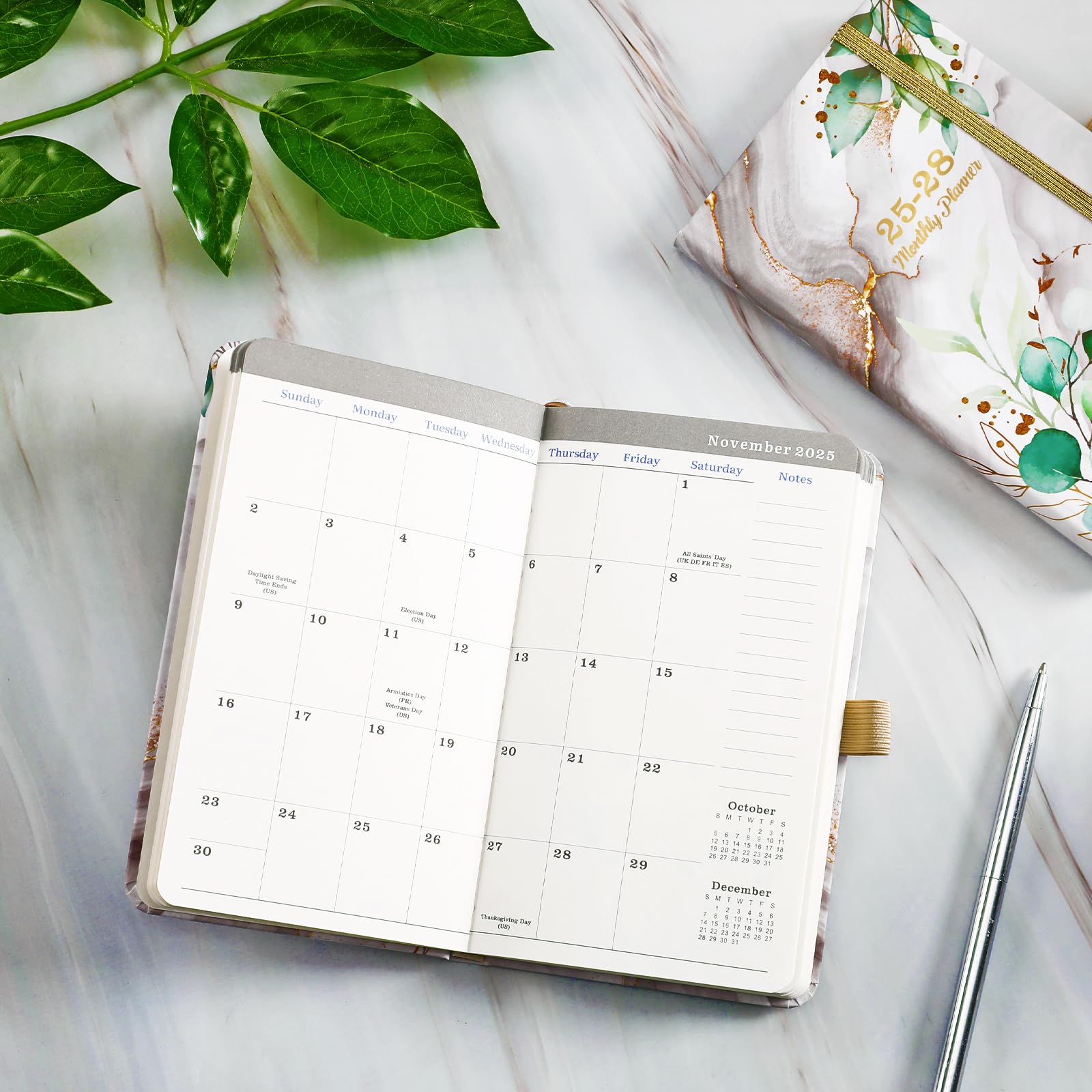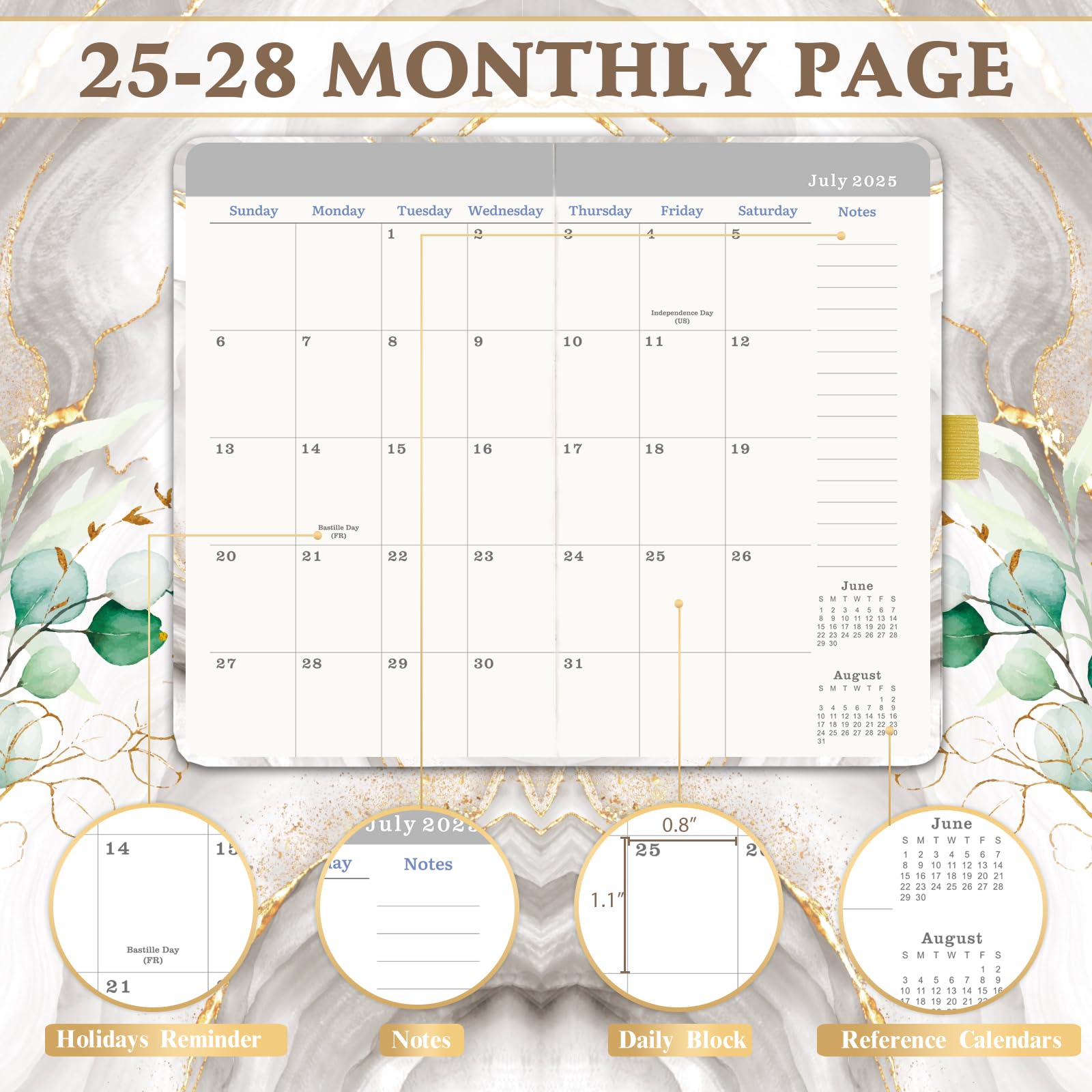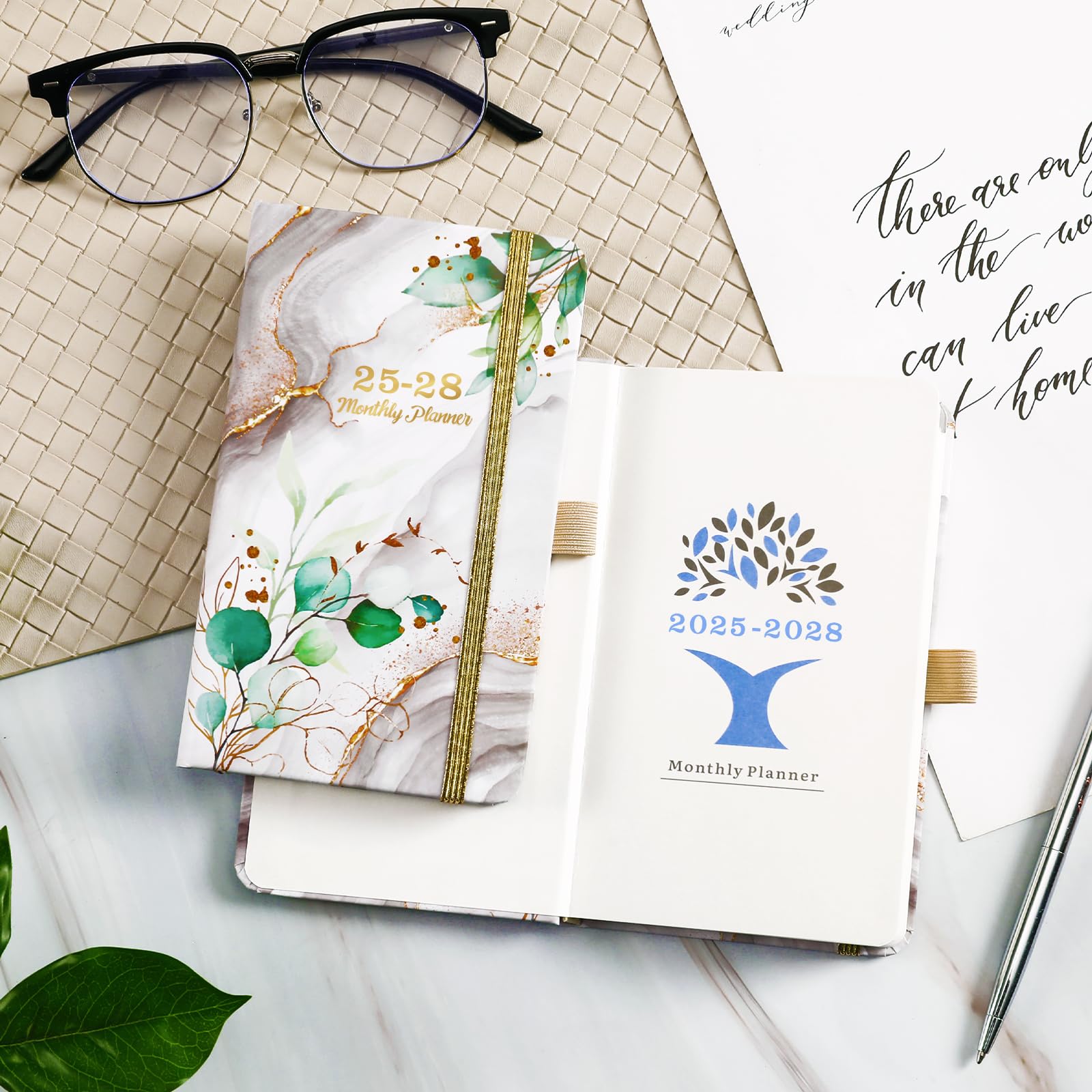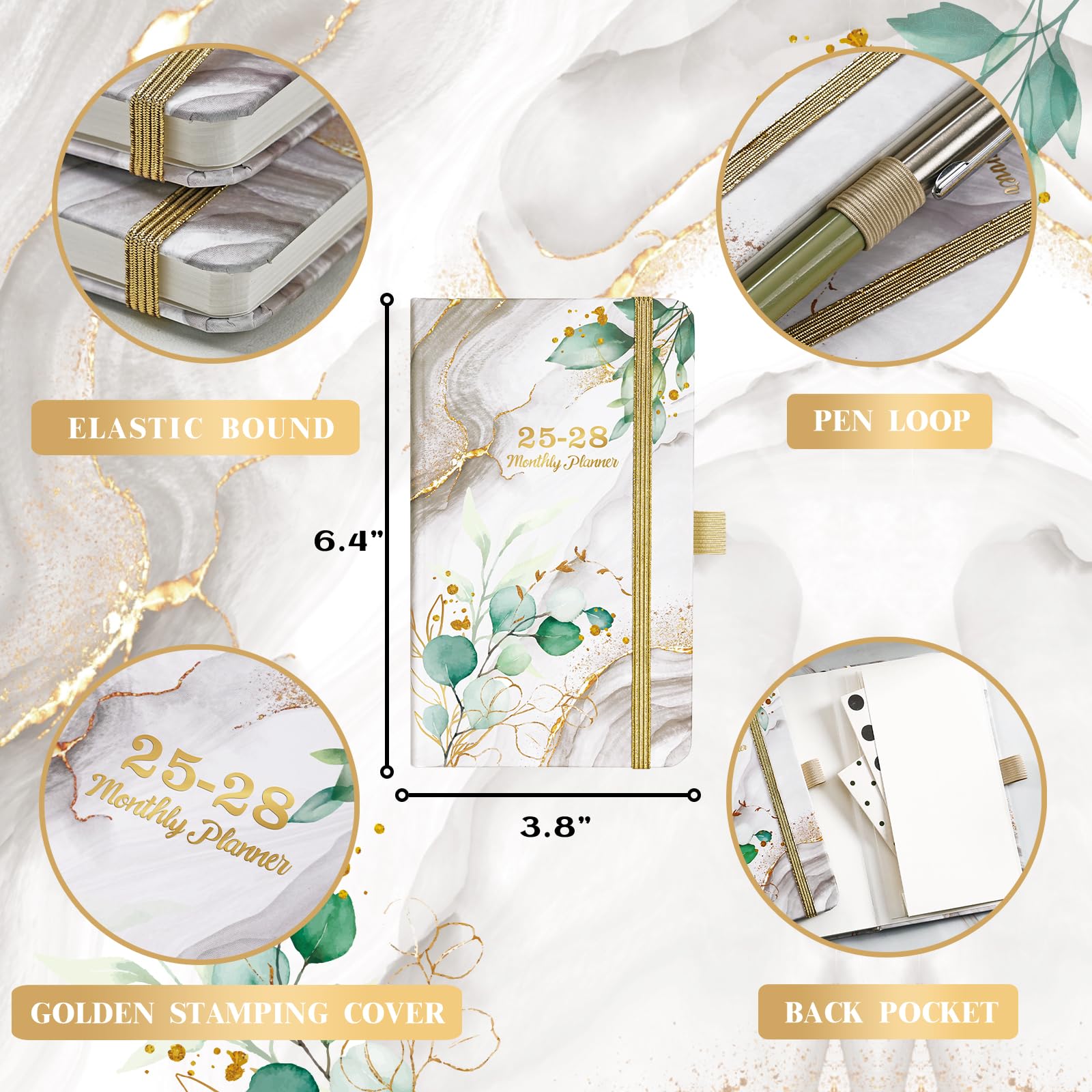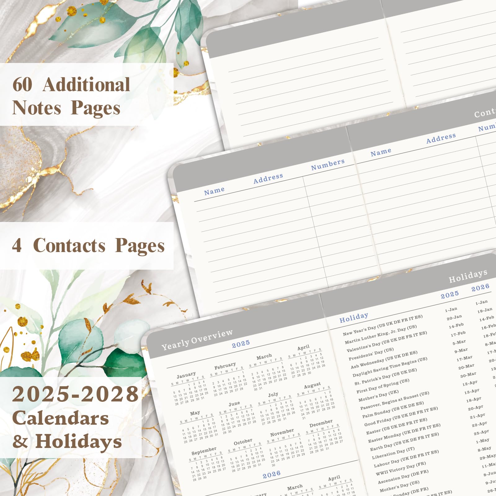 - Functional Design – Monthly pocket calendar 2025-2028 features Durable Cover and Round Corner & 2 Book Marks & Elastic Closure & Pen Holder Loop & 2025-2028 Yearly Overview and Holidays & 4 Contacts Pages & 61 Note Pages