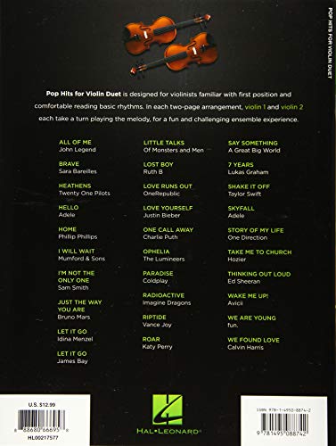 (String Duet). Designed for violinists familiar with first position and comfortable reading basic rhythms, each two-page arrangement in this collection includes a violin 1 and violin 2 part, with each taking a turn at playing the melody for a fun and challenging ensemble experience. Songs include: All of Me * Hello * Just the Way You Are * Let It Go * Love Yourself * Ophelia * Riptide * Say Something * Shake It Off * Story of My Life * Take Me to Church * Thinking Out Loud * Wake Me Up! * and more.