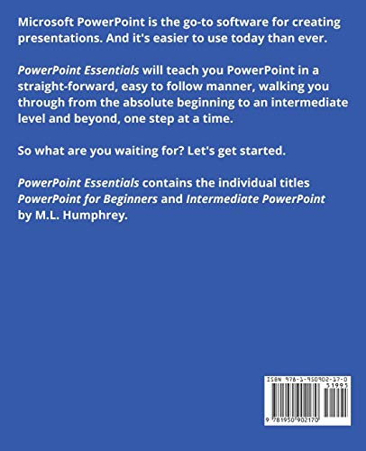 Microsoft PowerPoint is the go-to software for creating presentations. And it’s easier to use today than ever. PowerPoint Essentials will teach you PowerPoint in a straight-forward, easy to follow manner, walking you through from the absolute beginning to an intermediate level and beyond, one step at a time. So what are you waiting for? Let’s get started. PowerPoint Essentials contains the individual titles PowerPoint for Beginners and Intermediate PowerPoint by M.L. Humphrey.