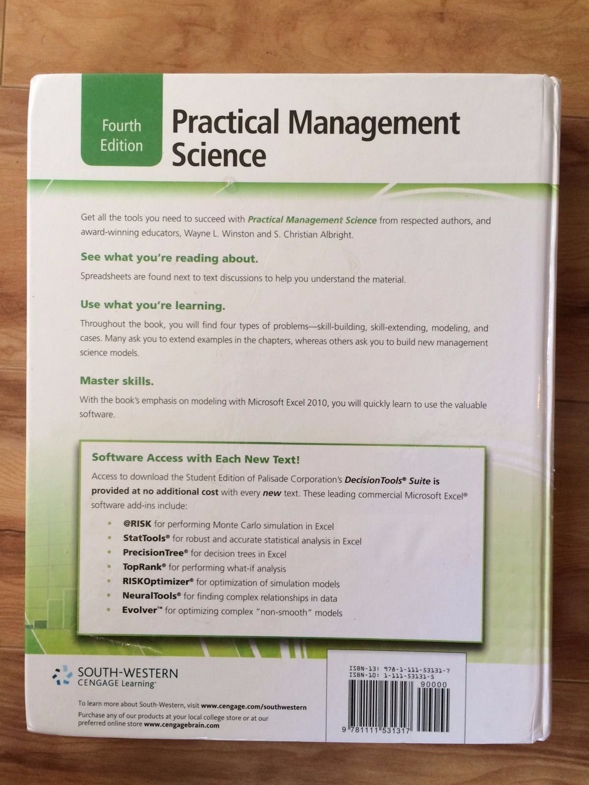 Easy to understand and to the point, PRACTICAL MANAGEMENT SCIENCE uses an active-learning approach and realistic problems to help you understand and take advantage of the power of spreadsheet modeling. With real examples and problems drawn from finance, marketing, and operations research, you will easily come to see how management science applies to your chosen profession and how you can use it on the job. The authors emphasize modeling over algebraic formulations and memorization of particular models. The essentials resource website, whose access is available with every new book, includes links to the following add-ins: the Palisade Decision Tools Suite (@RISK, StatTools, PrecisionTree, TopRank, RISKOptimizer, NeuralTools, and Evolver); and SolverTable, which allows you to do sensitivity analysis. All of these add-ins have been revised for Excel 2010.