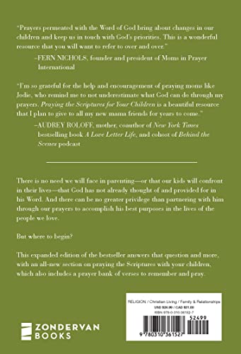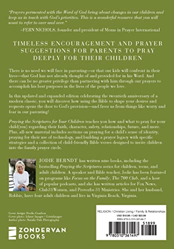 OVER 500,000 SOLD IN THE PRAYING THE SCRIPTURES SERIES There is no need we will face in parenting–or that our kids will confront in their lives–that God hasn’t already thought of and provided for in his Word. But where do we even begin? Bible teacher and author Jodie Berndt has been there too. Drawing on the life-changing power of God’s Word, this expanded 20th anniversary edition of Jodie’s bestseller Praying the Scriptures for Your Children teaches you how to pray for all aspects of your child’s life, including: Your child’s identity Your child’s health and safety Your child’s use of technology Your child’s faith Your child’s future . . . and so much more With her signature warmth and humor, Jodie reminds us that there can be no greater privilege than partnering with God through our prayers to accomplish his best purposes in the lives of our children–let Praying the Scriptures for Your Children show you the way. Praise for Praying the Scriptures for Your Children: “Using the Scriptures as a framework for my prayers has been incredibly fruitful for me. Jodie’s book has given me an extremely practical and intentional way to pray for my children. You will find yourself being led by the Spirit as you pray God’s promises over the people you love.” –Emily Maynard Johnson, former Bachelorette and New York Times bestselling author of I Said Yes