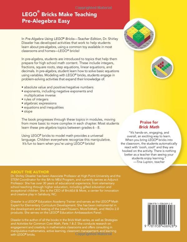 In Pre-Algebra Using LEGO(r) Bricks–Teacher Edition, Dr. Shirley Disseler has developed activities that work to help students learn about pre-algebra, using a common toy available in most classrooms and homes–LEGO(r) bricks! In pre-algebra, students are introduced to topics that help them prepare for high school math content. These include integers, fractions, square roots, step equations, linear equations, and decimals. In pre-algebra, student learn how to solve basic equations using variables. Modeling with LEGO(r) bricks, students engage in problem-solving activities that expand their knowledge of: * absolute value and positive/negative numbers * exponents, including negative exponents and multiplicative inverse * rules of integers * algebraic expressions * equations and inequalities * slope The book progresses through these topics in modules, moving from more basic to more complex in each chapter. Most students learn these pre-algebra topics between grades 6 – 8. Using LEGO(r) bricks to model math provides a universal language. Children everywhere recognize this manipulative. It’s fun to learn when you’re using LEGO(r) bricks!