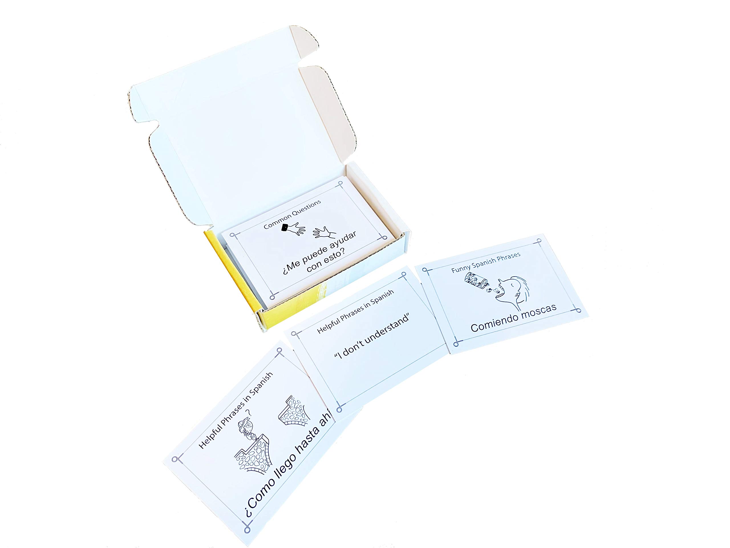 - POCKET SIZE: Our Learn Spanish Flashcard deck is designed very carefully so that it travels easy and endures endless hours of study. The cards are not too big, nor too small and can be easily kept in your pocket. They come in a corrugated cardboard box with a Dreamcoat gloss (think hard gloss shell), meaning they’ll hold up anywhere.