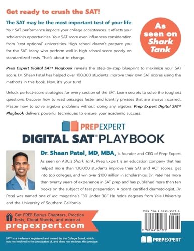 Get ready to crush the SAT! The SAT may be the most important test of your life. Your SAT performance impacts your college acceptances. It affects your scholarship opportunities. Your SAT score even influences consideration from “test-optional” universities. High school doesn’t prepare you for the SAT. Many who perform well in high school score poorly on standardized tests. That’s about to change. Prep Expert Digital SAT Playbook reveals the step-by-step blueprint to maximize your SAT score. Dr. Shaan Patel has helped over 100,000 students improve their own SAT scores using the methods in this book. Now, it’s your turn! Unlock perfect-score strategies for every section of the SAT. Learn secrets to solve the toughest questions. Discover how to read passages faster and identify phrases that are always incorrect. Master how to solve algebra problems without doing any algebra. Prep Expert Digital SAT Playbook delivers powerful techniques to ensure your academic success.