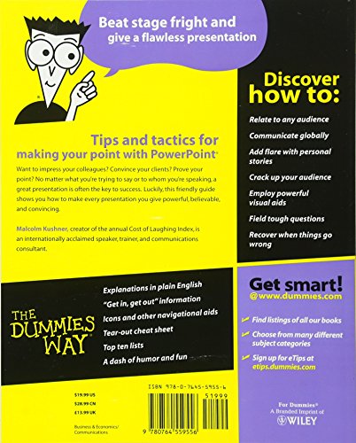 Whether youre dealing with one person or one thousand, the ability to transmit ideas in a coherent and compelling fashion is one of the most important skills you can ever develop. Want to impress your colleagues? Convince your clients? Prove your point? The key to success is what you say. To get what you want in life, you have to present yourself forcefully, credibly, and convincingly. If you need to land that big consulting job or launch a new initiative at the office, knowing how to present your case is half the battle. Luckily, Presentations For Dummies shows you the way. It gives you all the tools and tips you need to make your presentations flawless and effective, including proven advice on: Relating to your audience Overcoming stage fright Adding flare with personal stories Using humor to loosen up the crowd Making your point with visual aids From getting prepared to dealing with unexpected problems while youre the focus of attention, this handy guide covers everything you need to make all your presentations flawless. Youll learn how to create fantastic, effective visual aids that make your point with passion, and a whole lot more: Gathering sources and compiling data Organizing your ideas Improving your timing for maximum impact Using your pre-presentation nerves as an asset Choosing the perfect word in every instance Crafting an introduction, conclusion, and transitions Using PowerPoint to make your point Understanding what body language says about you Simple tricks for every situation Written by consultant, humorist, and professional speaker Malcolm Kushner, Presentations For Dummies tells you everything you need to know and do to get it right from the start. But be careful, this powerful resource could make your presentations so good that you might have to give more of them.