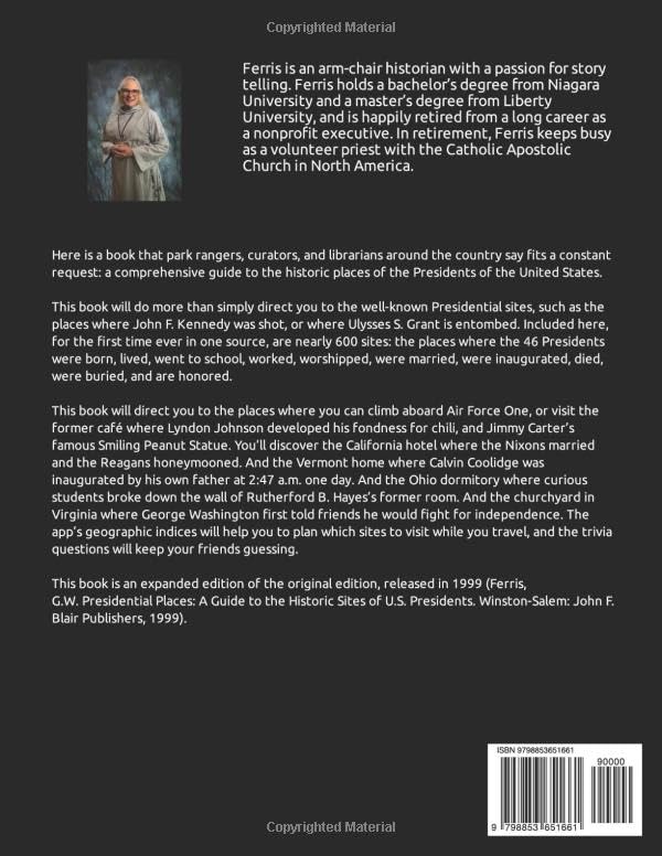 Here is a book that park rangers, curators, and librarians around the country say fits a constant request: a comprehensive guide to the historic places of the Presidents of the United States. This book will do more than simply direct you to the well-known Presidential sites, such as the places where John F. Kennedy was shot, or where Ulysses S. Grant is entombed. Included here, for the first time ever in one source, are nearly 600 sites: the places where the 46 Presidents were born, lived, went to school, worked, worshipped, were married, were inaugurated, died, were buried, and are honored. This book will direct you to the places where you can climb aboard Air Force One, or visit the former cafe where Lyndon Johnson developed his fondness for chili, and Jimmy Carter’s famous Smiling Peanut Statue. You’ll discover the California hotel where the Nixons married and the Reagans honeymooned. And the Vermont home where Calvin Coolidge was inaugurated by his own father at 2:47 a.m. one day. And the Ohio dormitory where curious students broke down the wall of Rutherford B. Hayes’s former room. And the churchyard in Virginia where George Washington first told friends he would fight for independence. The app’s geographic indices will help you to plan which sites to visit while you travel, and the trivia questions will keep your friends guessing. This book is an expanded edition of the original edition, released in 1999 (Ferris, G.W. Presidential Places: A Guide to the Historic Sites of U.S. Presidents. Winston-Salem: John F. Blair Publishers, 1999).