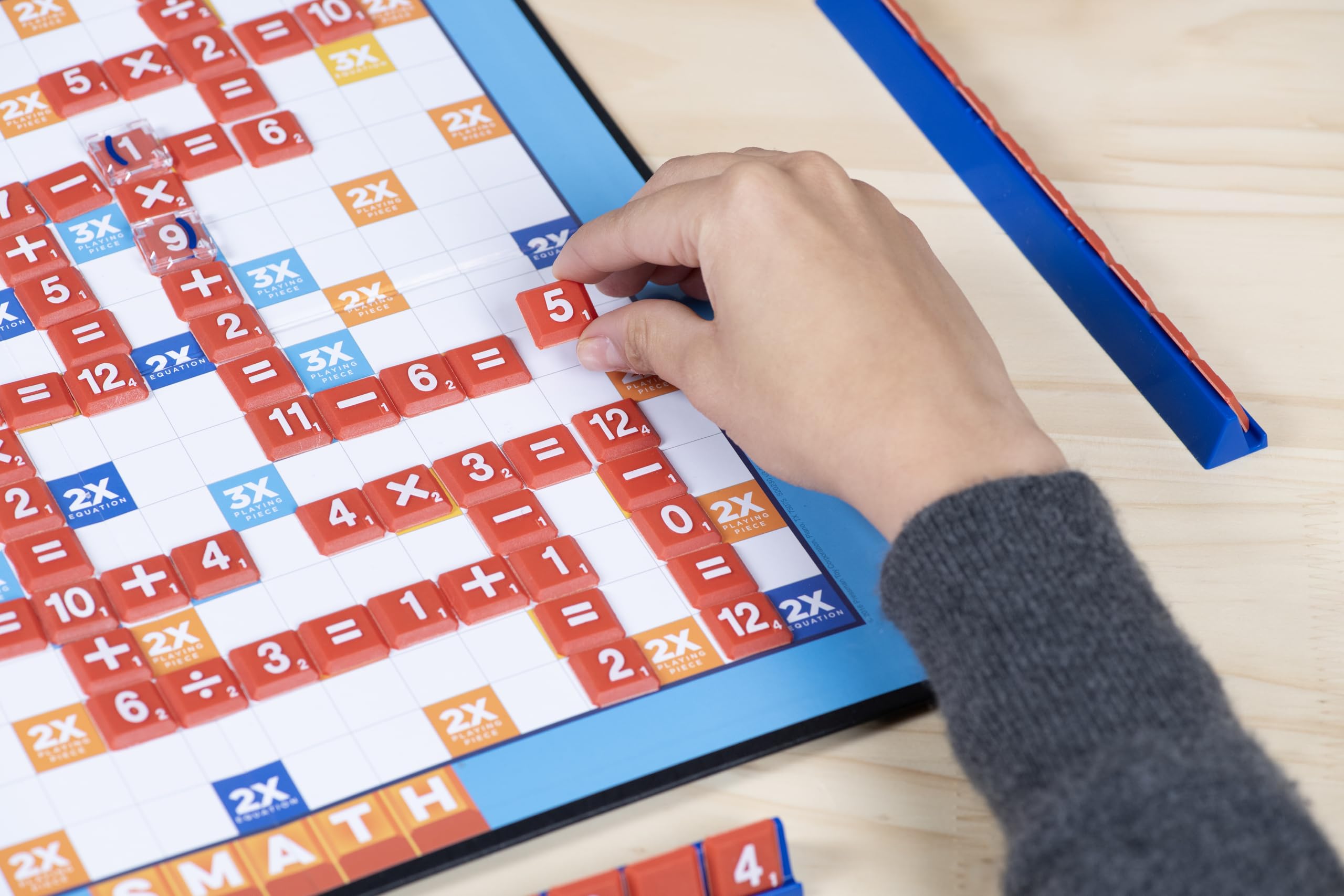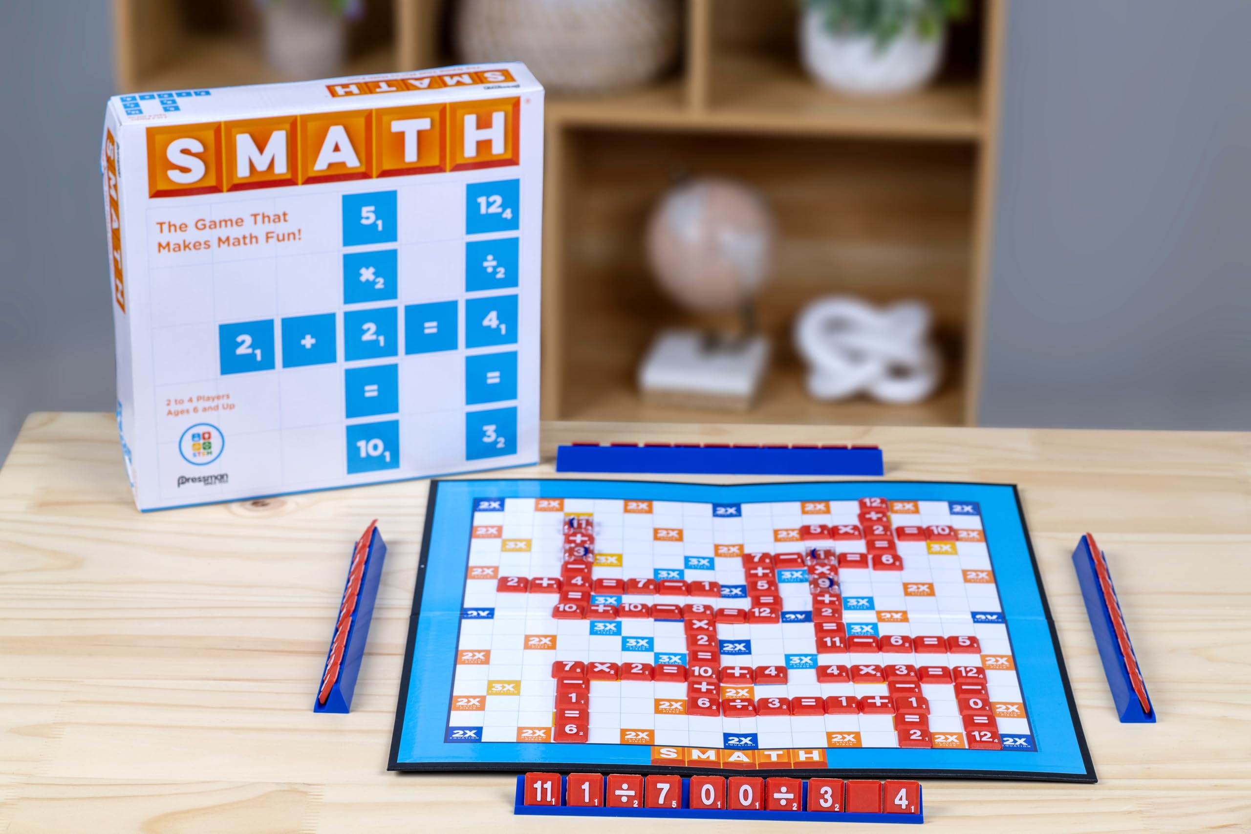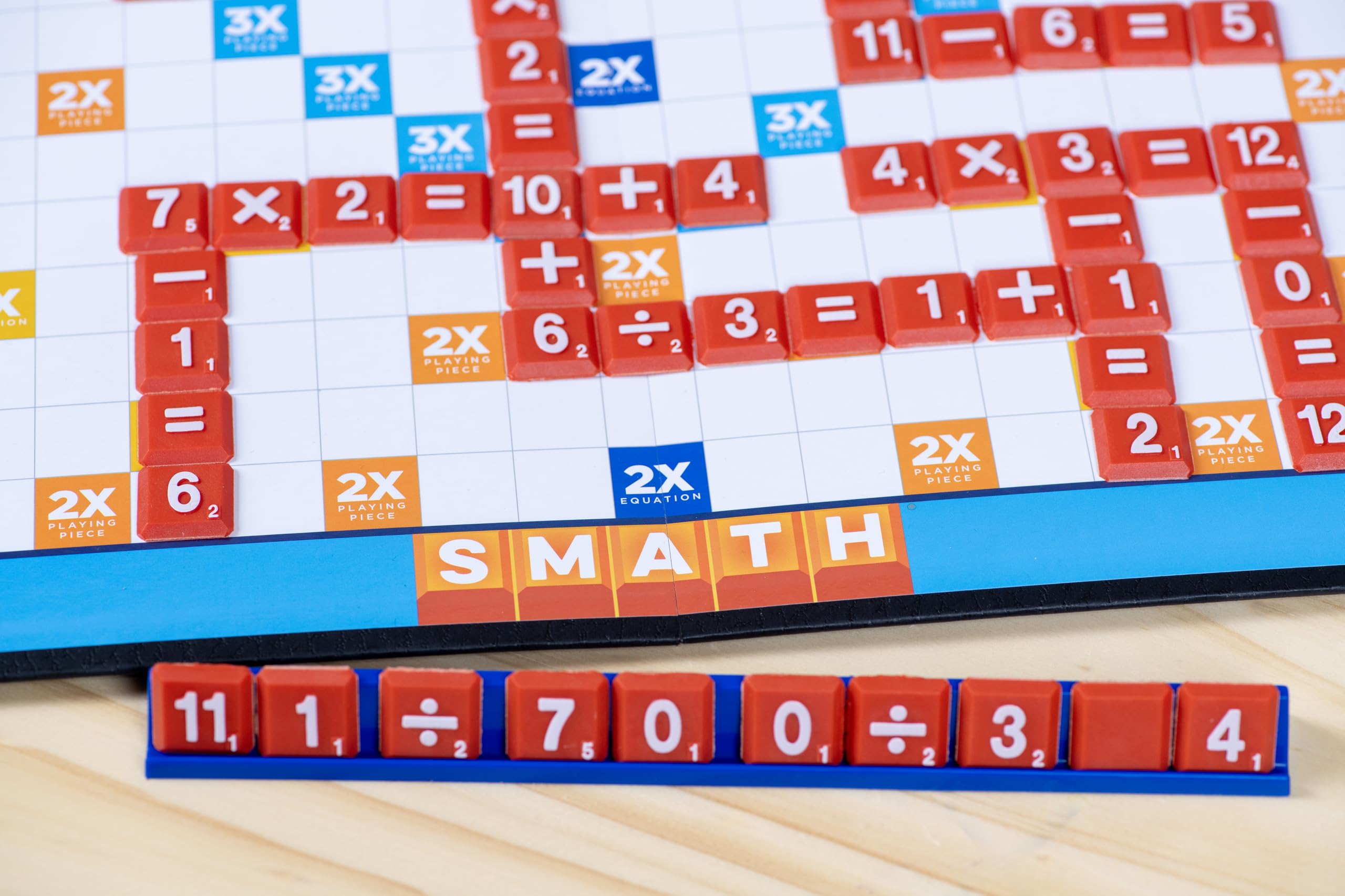 Amazon.com Practice makes perfect in the world of math, but practice is more fun when it’s a game instead of homework. The rules of this board game resemble those in Scrabble, but Smath is played by creating math equations instead of words. The game includes a playing board and lots of tiny tiles with numbers, signs for math operations, and brackets to create more complex equations, which players can place on the board horizontally or vertically. The game can be played at different levels of difficulty, from simple addition problems to equations combining operations (for example, (2)(2 + 3) = 5 x 2). The game is for two to four players at different levels of math proficiency, making this an educational (but still entertaining) game for the entire family, the classroom, or for home schoolers. –Marcie Bovetz Product Description SMATH is the game that makes math fun! Players take turns using the tiles in their racks to build their own crossword style equations. For beginners, start off with addition and subtraction. For the math whiz, step it up to multiplication and division! Each tile has a point value that is earned once it is played. The player with the most points at the end of the game wins! For 2-4 players, ages 6 and up. From the Manufacturer Crossword-puzzle type play that makes learning math fun. For 2 to 4 players, ages 6 and up.