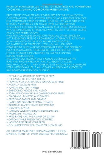NEW IN THIS UPDATED MARCH 2014 EDITION: * Coverage of the iPad and iPhone Prezi-app * How to work with Prezi on Android * Shared folders and how to use them * The new Prezi image editing possibilities * Over 80 illustrations * Several minor layout fixes Prezi offers complete new possibilities for the visualization of information. But how will Prezi do as a presentation tool for corporate presentations? How will we make sure it will be taken as seriously on Board level as Powerpoint? This guide is intended for managers and other professionals who are interested in Prezi and want to use it for their Board- and other presentations. Prezi for Managers stands out from all other guides by not presenting Prezi as a Powerpoint alternative, but rather as an extension of the tool we all know so well. No matter what others tell you: you will still need Powerpoint while making corporate prezis. Including numerous step-by-step instructions, the focus of Prezi for Managers therefore is to use the strong points of both Powerpoint and Prezi to create stunning Board presentations. This March 2014 edition will cover all relevant aspects of any board presentation, such as: * Defining a structure for your prezi * The basics of the prezi editor * How to make corporate templates in Prezi * Agenda slides in Prezi * Formatting text in Prezi * Embedding videos and audio * Formatting images in Powerpoint or Prezi * Diagrams, symbols and shapes * Prezifying tables and graphs * Handling organizational charts * Inserting Gantt charts or timelines * Creating layers * Various slide transitions between steps * Fading in – Fading out * Prezi paths and the power of zoom * Options while presenting you prezi * How to best print your prezi * Collaboration with teams or individuals All this will make Prezi For Managers the ideal starting point for every business professional! Siebe Beintema has over 15 years of IT management experience, having made numerous presentations on Board level.