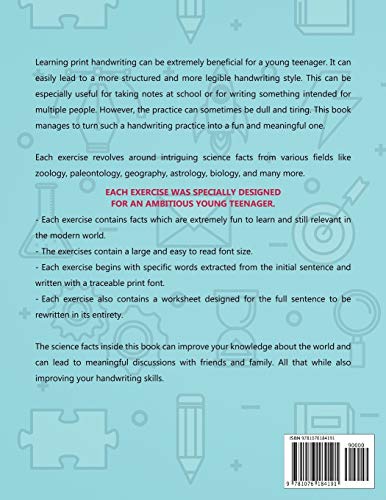 Print Handwriting Practice for Teens with Fun and Intriguing Science Facts! – (Updated and Edited) Learning print handwriting can be extremely beneficial for a young teenager. It can easily lead to a more structured and more legible handwriting style. This can be especially useful for taking notes at school or for writing something intended for multiple people. However, the practice can sometimes be dull and tiring. This book manages to turn such a handwriting practice into a fun and meaningful one. Each exercise revolves around intriguing science facts from various fields like zoology, paleontology, geography, astrology, biology, and many more. Each exercise was specially designed for an ambitious young teenager. Each exercise contains facts which are extremely fun to learn and still relevant in the modern world. You can quickly improve your knowledge about the world that surrounds us in a fun and enjoyable way. The exercises contain a large and easy to read font size. Each exercise begins with specific words extracted from the initial sentence and written with a traceable print font. Each exercise also contains a worksheet designed for the full sentence to be rewritten in its entirety. The science facts inside this book can improve your knowledge about the world and can lead to meaningful discussions with friends and family. All that while also improving your handwriting skills. Regardless of age, this book has value for everybody. If you want to discover interesting science facts and master the skill of print handwriting, then scroll up and click the “Add to Cart” button now! Start your journey towards handwriting mastery!