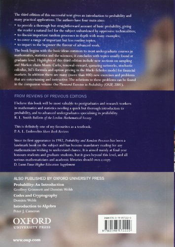 This book gives an introduction to probability and its many practical application by providing a thorough, entertaining account of basic probability and important random processes, covering a range of important topics. Emphasis is on modelling rather than abstraction and there are new sections on sampling and Markov chain Monte Carlo, renewal-reward, queueing networks, stochastic calculus, and option pricing in the Black-Scholes model for financial markets. In addition, there are almost 400 exercises and problems relevant to the material. Solutions can be found in One Thousand Exercises in Probability.