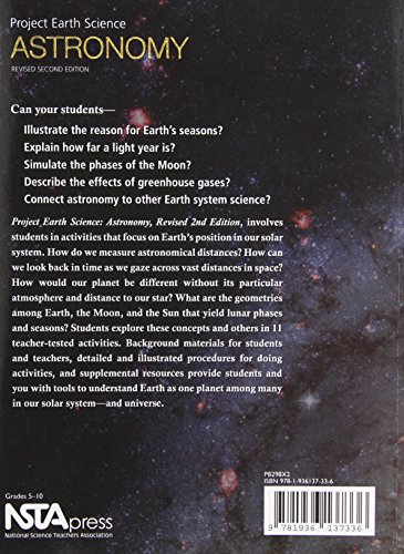 How well can your students … Illustrate the reason for Earth s seasons? Explain how far a light year is? Simulate the phases of the Moon? Describe the effects of greenhouse gases? Connect astronomy to other Earth system science? Project Earth Science: Astronomy, Revised 2nd Edition, involves students in activities that focus on Earth s position in our solar system. How do we measure astronomical distances? How can we look back in time as we gaze across vast distances in space? How would our planet be different without its particular atmosphere and distance to our star? What are the geometries among Earth, the Moon, and the Sun that yield lunar phases and seasons? Students explore these concepts and others in 11 teacher-tested activities. Background materials for students and teachers, detailed and illustrated procedures for doing activities, and supplemental resources provide students and teachers with tools to understand Earth as one planet among many in our solar system and universe.