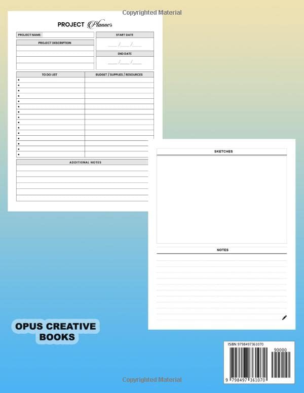 Time to get organized! Get all the resources for your project neatly displayed in this Project Planner. Stay focused and progressing on your jobs by knowing exactly what needs to be done. This is a time saver for small business owners, project managers, home improvements businesses, personal projects, and any time you need to keep track of your goals. Inside you will find: 102 Pages. Two pages per project, manage 50+ projects with this book. Brainstorm ideas and bring your goals into focus in the sketch area. Keep ongoing information and changes in the Meeting Notes area. Stay on top of your budget and resources by keeping track of expenses. Stay on task using the bullet point list template. Perfectly sized at 8.5 x 11 inches, letter size. Durable cover. Makes a great gift! Get one for you, and one for your bestie!