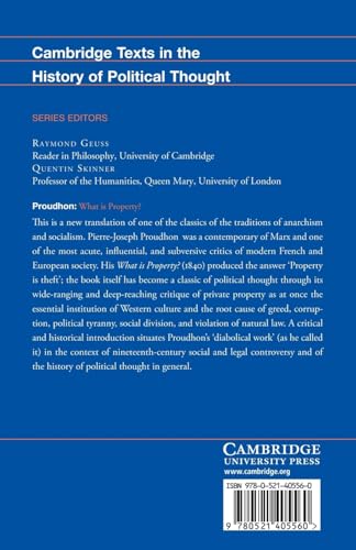 This is a new translation of one of the classics of the traditions of anarchism and socialism. Pierre-Joseph Proudhon was a contemporary of Marx and one of the most acute, influential, and subversive critics of modern French and European society. What is Property? (1840) has become a classic of political thought through its wide-ranging and deep-reaching critique of private property as at once the essential institution of Western culture and the root cause of greed, corruption, political tyranny, social division, and violation of natural law.