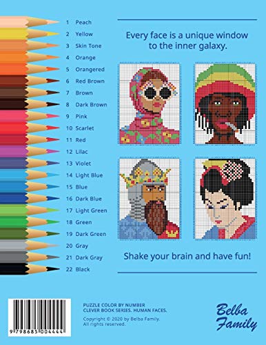PUZZLE COLOR BY NUMBER CLEVER BOOK SERIES. HUMAN FACES You hold in your hand some new format of color by number books. There are 25 pictures of different faces – some of them represent the lifestyle, other faces hold the ancient traditions or even epoch, some faces represent professions or subcultures. Every face is a unique window to the inner galaxy. We have followed your comments from two first books from the CLEVER BOOK SERIES and we have changed the location of a picture and a legend. You can color by following the legend on the left side; the picture will appear in the grid on the right side. The color palette is the same in all our books. There is no page with the answers but we prepare some hints before each picture. This is a perfect book if you do coloring as a stress-relieving and relaxation. But at the same time, you could feel how your brain is stirring. CLEVER BOOK SERIES Includes: BEGINNER level (no background): *SIMPLE BEAUTY *HUMAN FACES ADVANCED level (with background): *EXOTIC LIFE *SECRET PATTERNS Shake your brain and have fun!